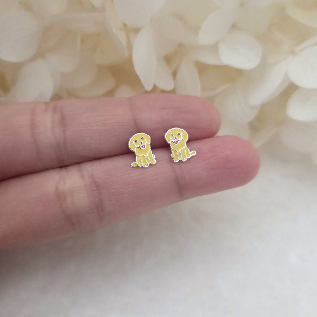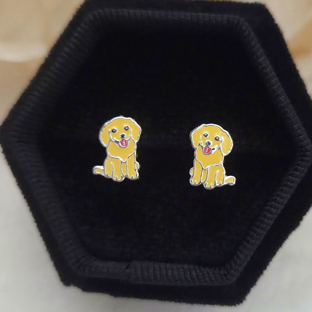 Yellow Dog Stud Earrings in 925 Sterling Silver – Solid Silver Puppy Studs with Enamel – Playful Pet Lover Jewelry Gift