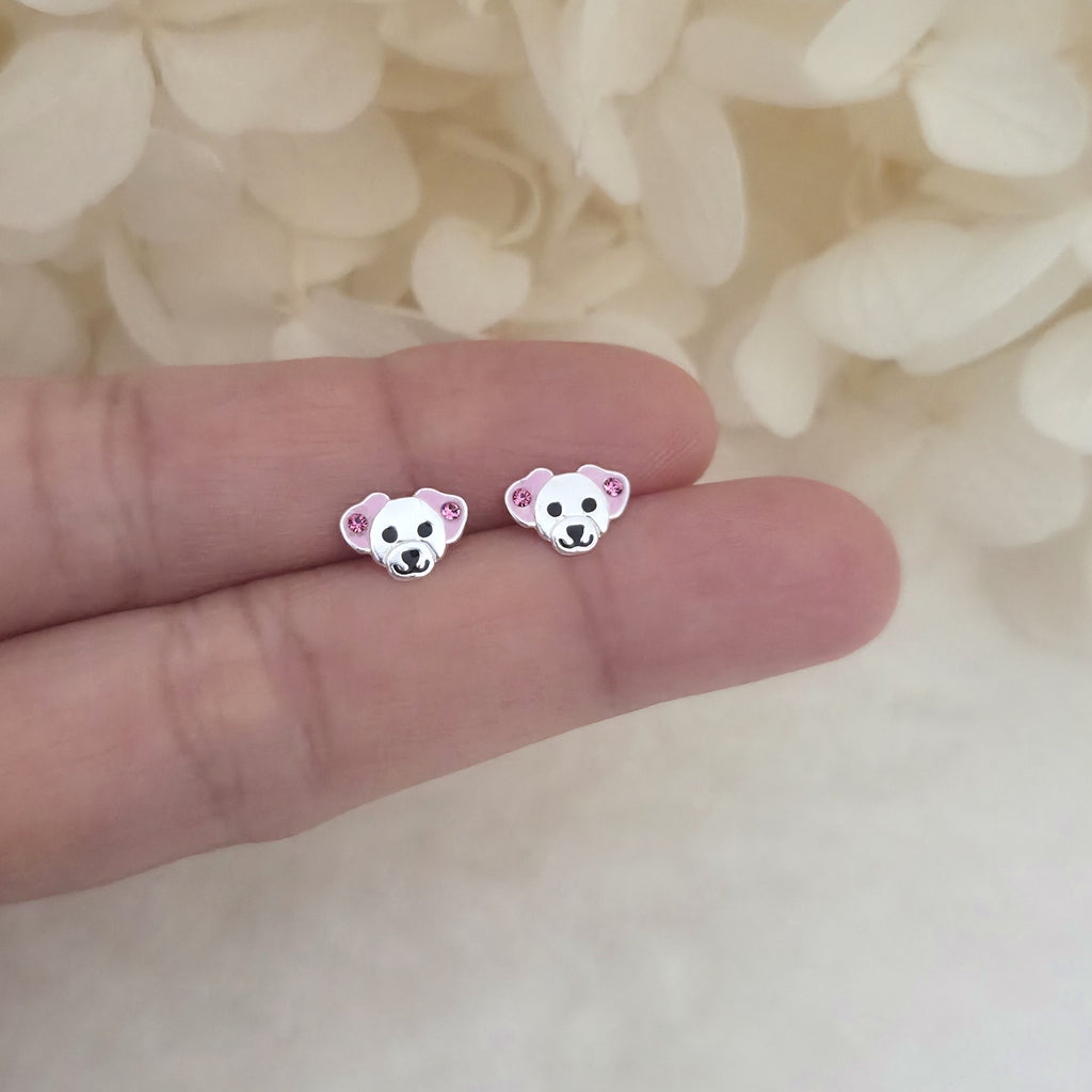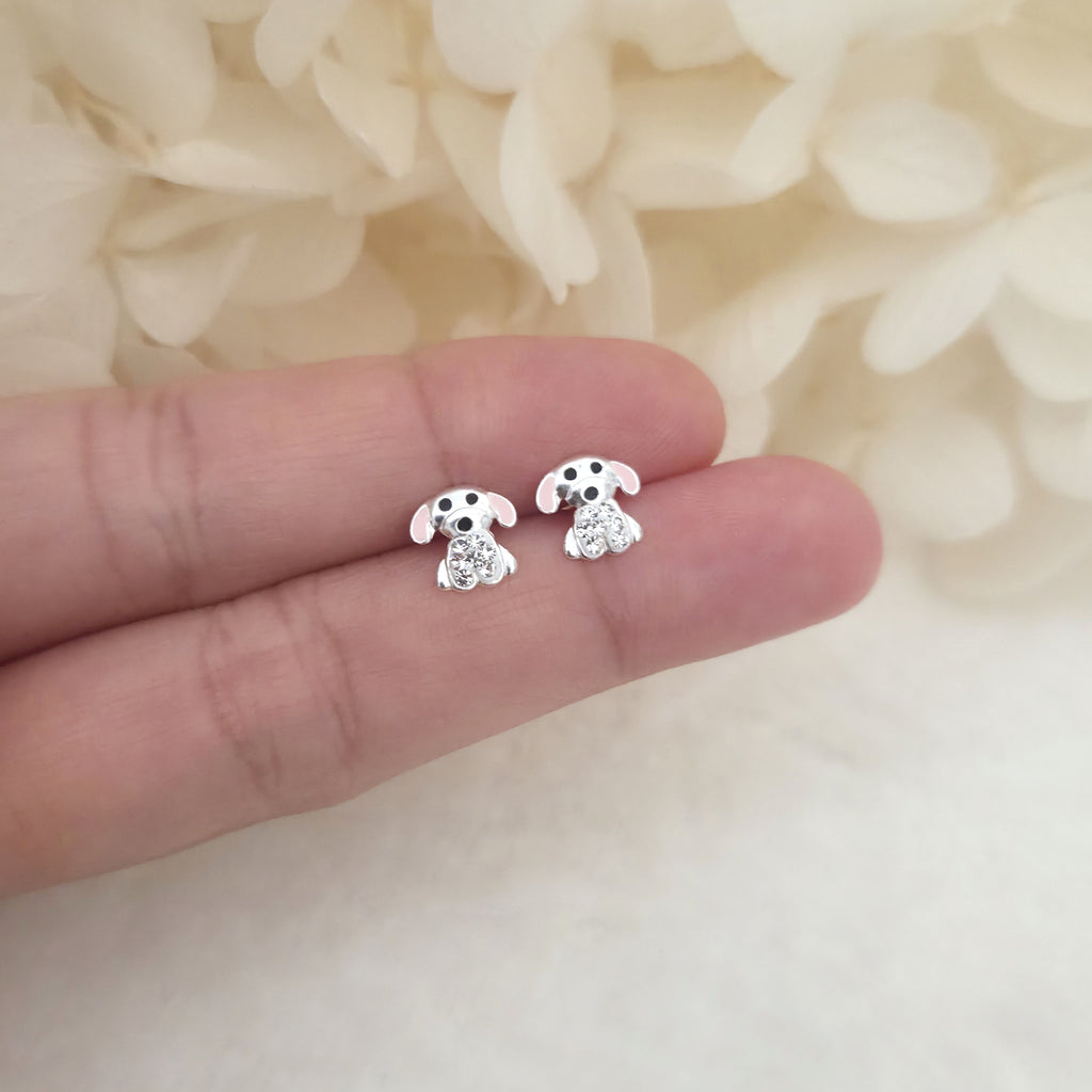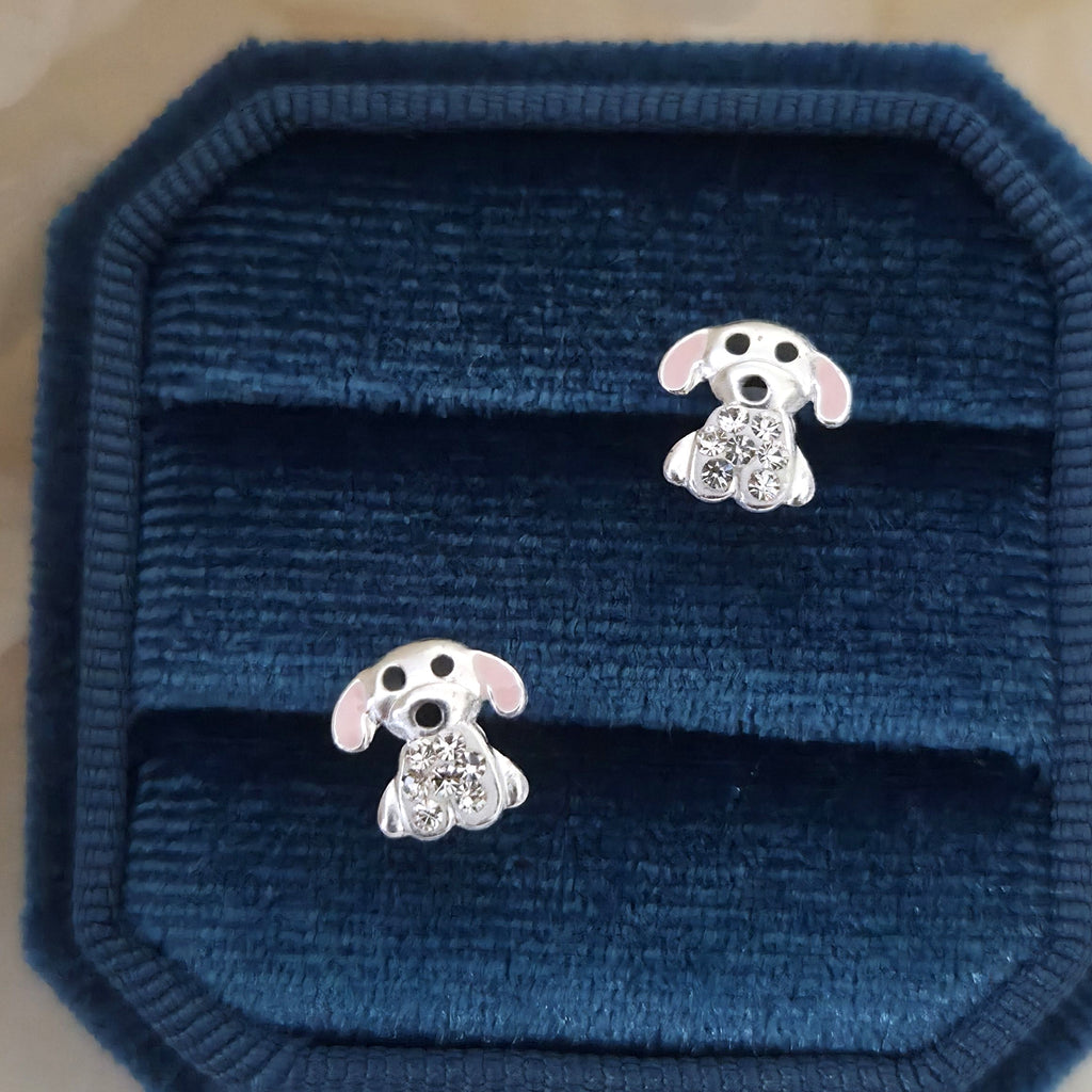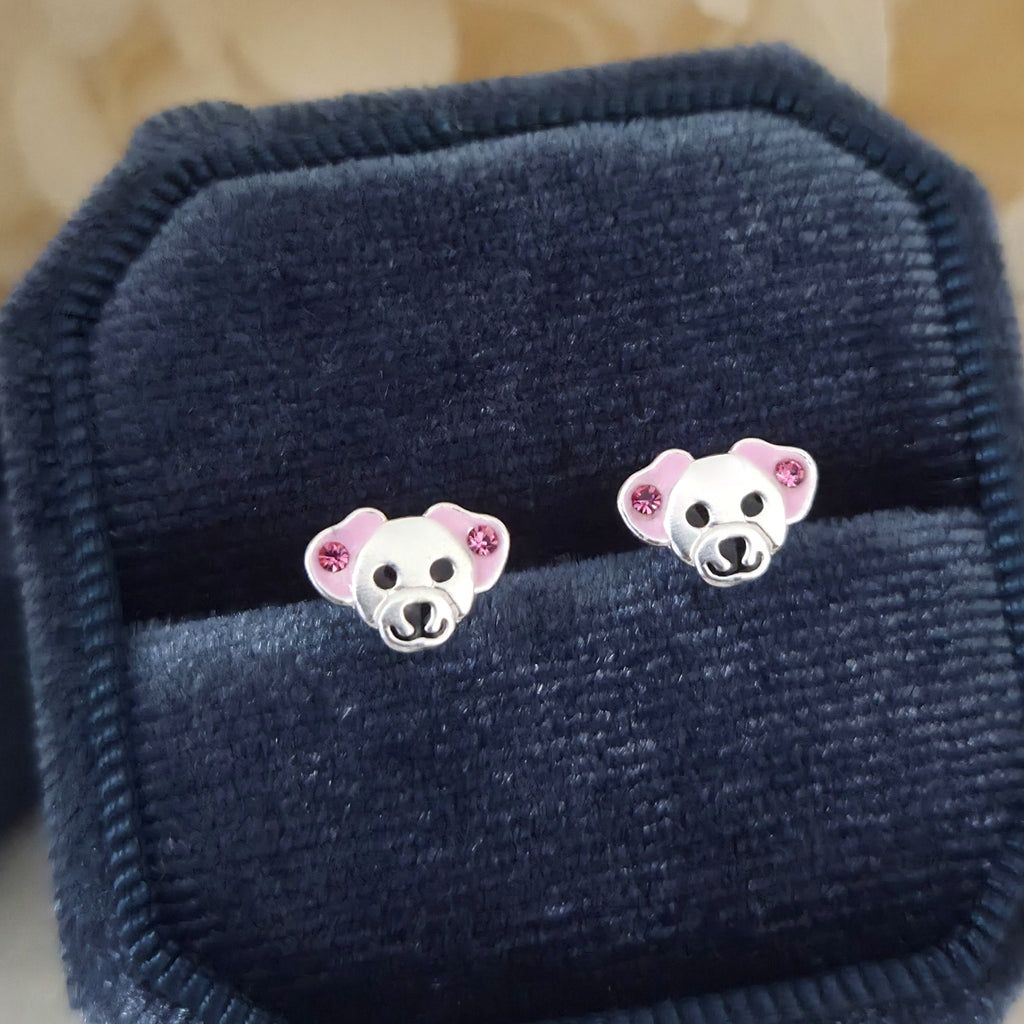 Cute Dog Stud Earrings in 925 Sterling Silver – Solid Silver Pink Puppy Studs with Enamel and Sparkling Crystal Details