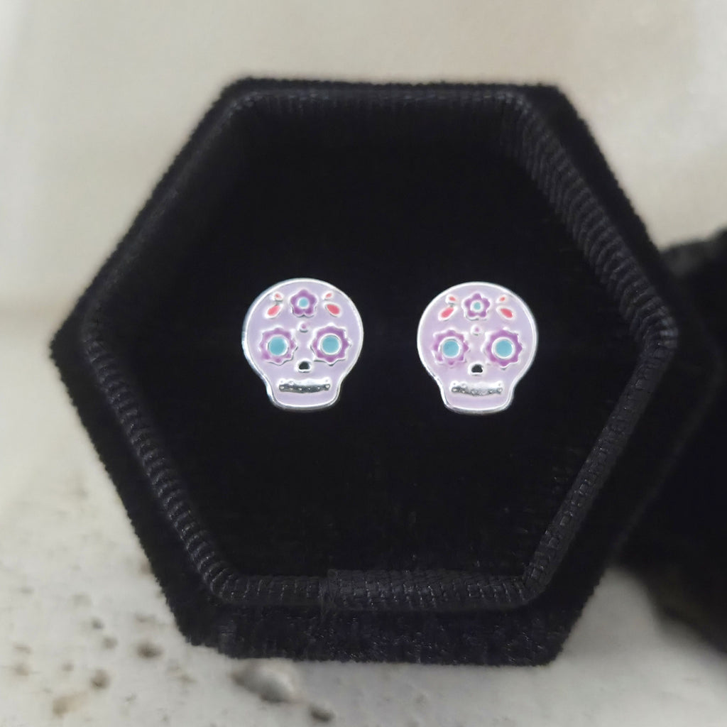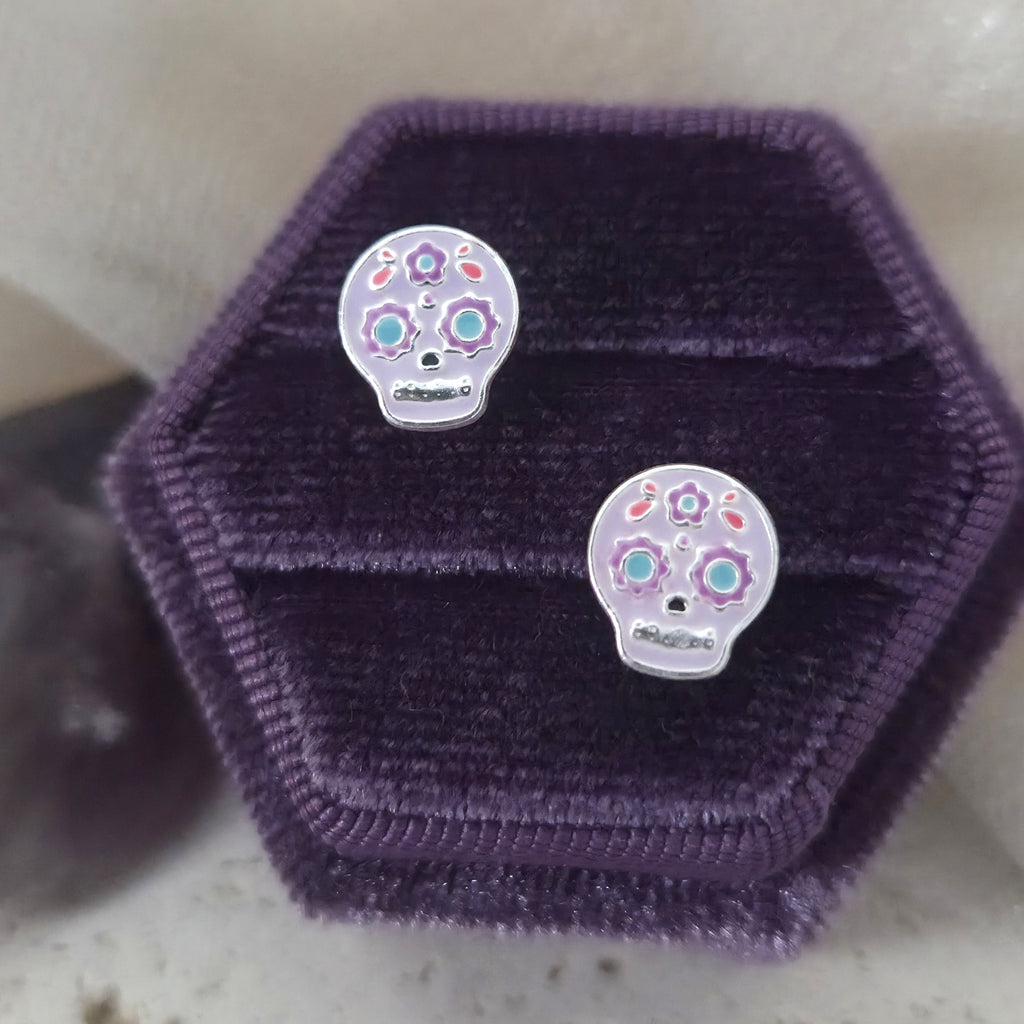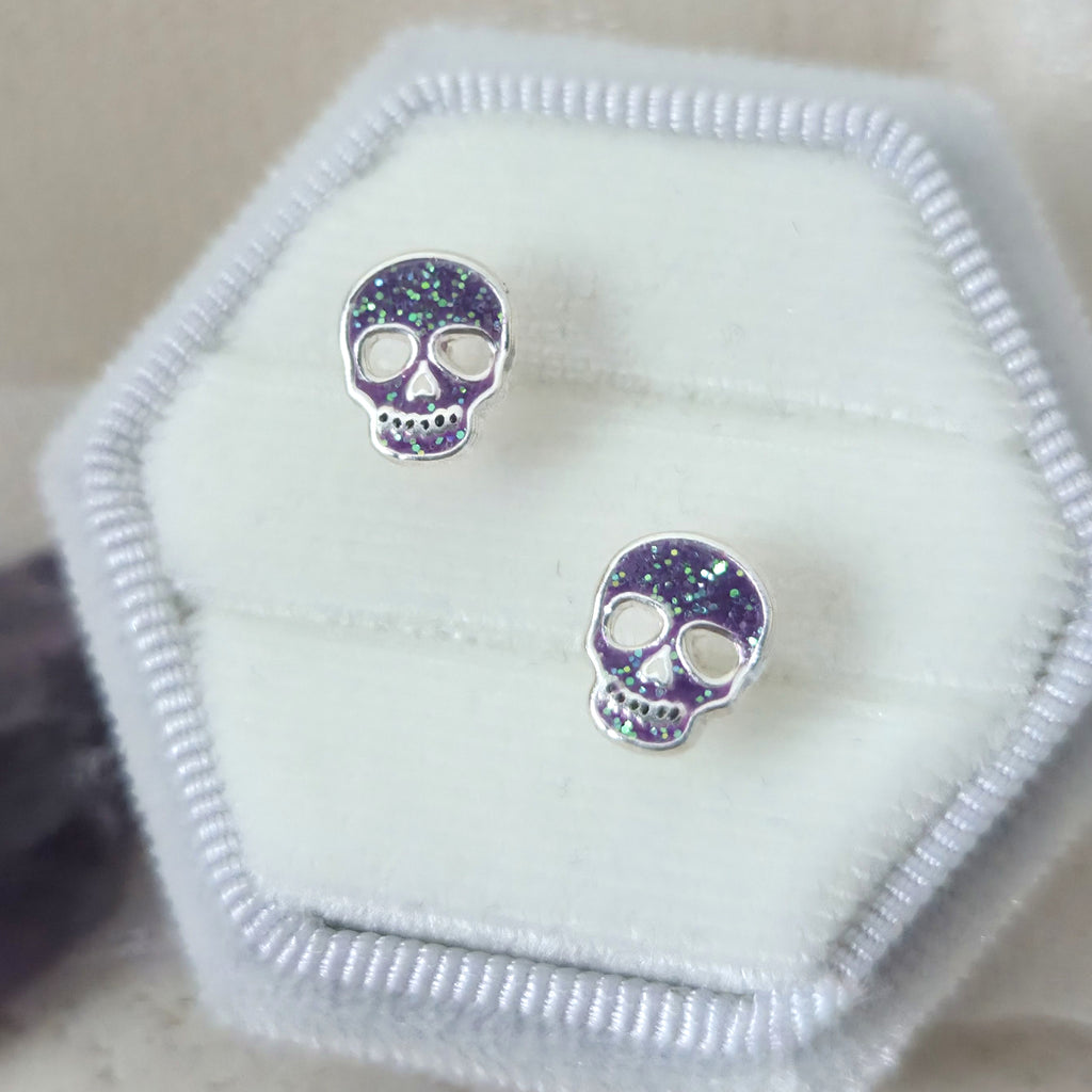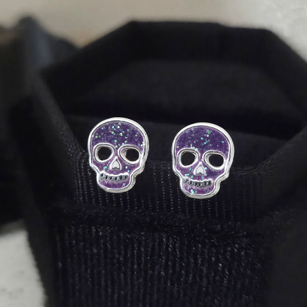 Purple Skull Stud Earrings in 925 Sterling Silver – Solid Silver Halloween Studs with Enamel