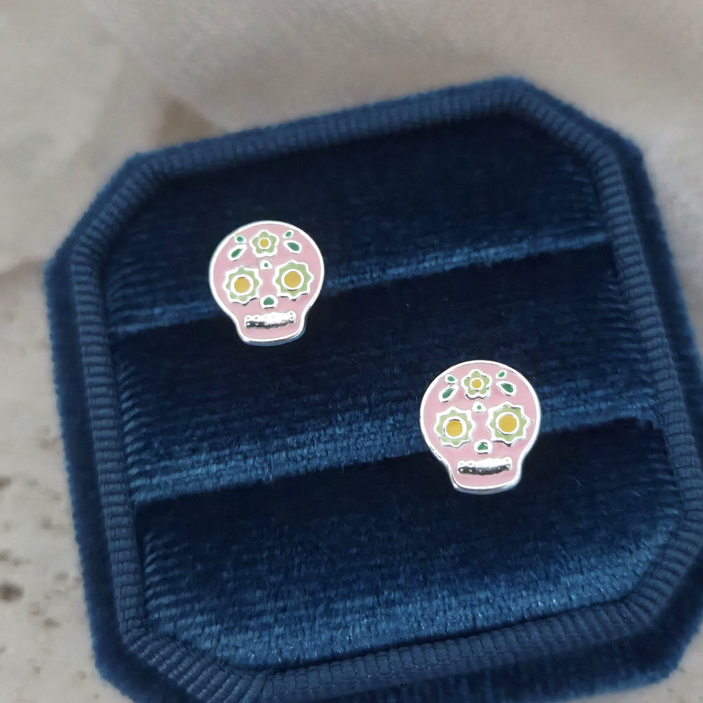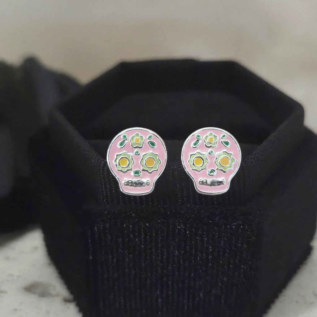 Pink & Green Skull Stud Earrings in 925 Sterling Silver – Solid Silver Halloween Studs with Enamel