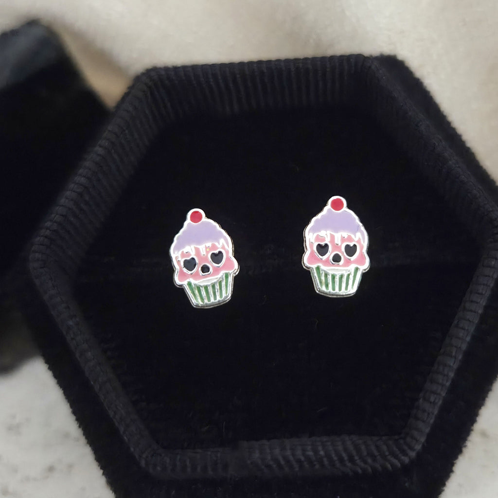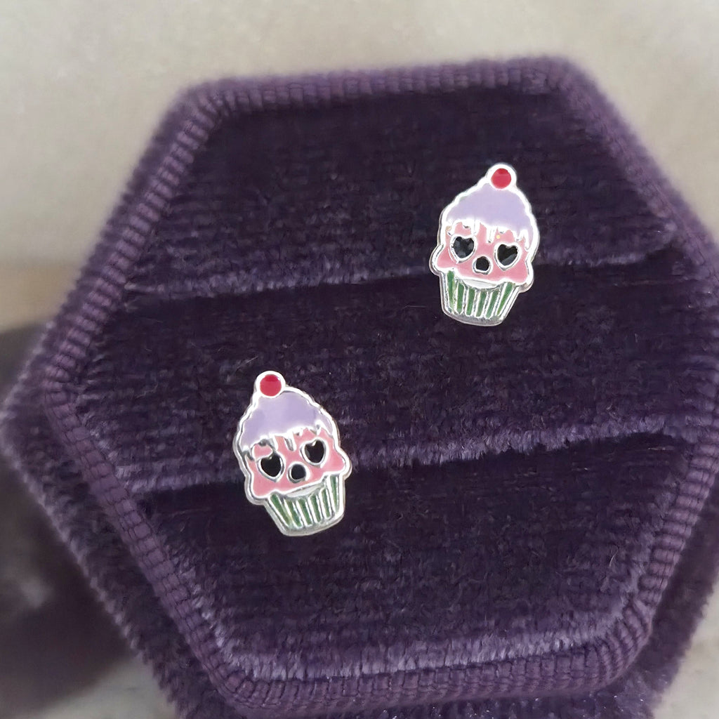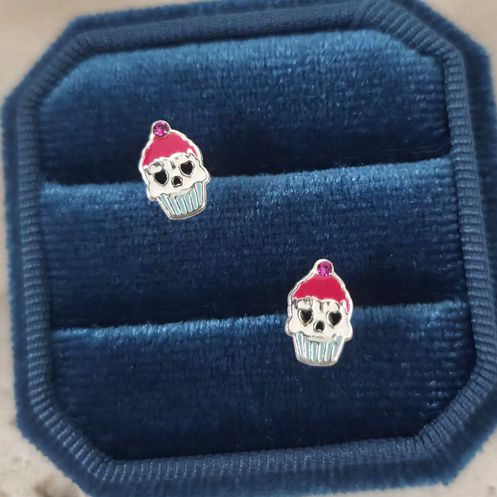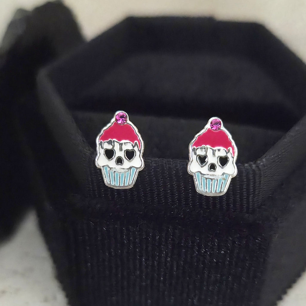 Mini Halloween Cupcake Stud Earrings in 925 Sterling Silver – Solid Silver Pink & Blue Skull Studs