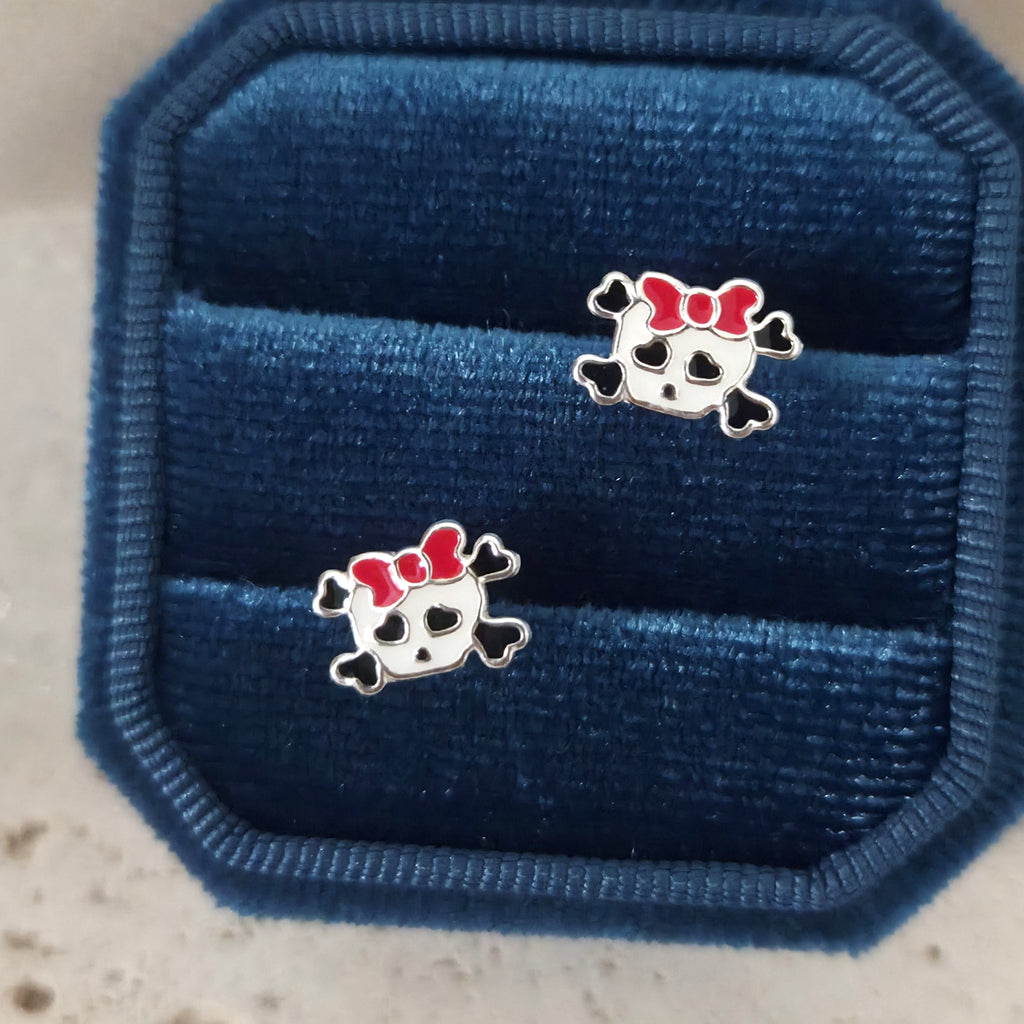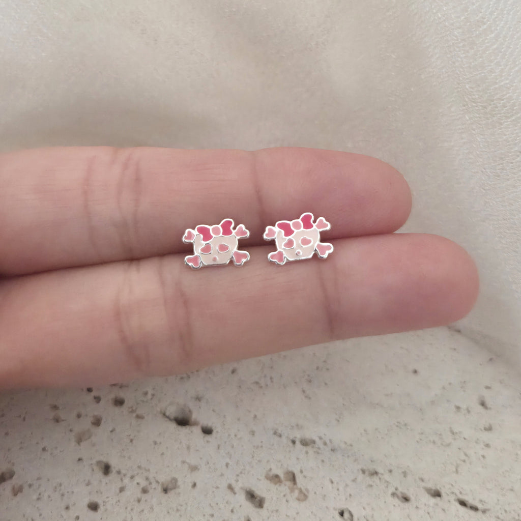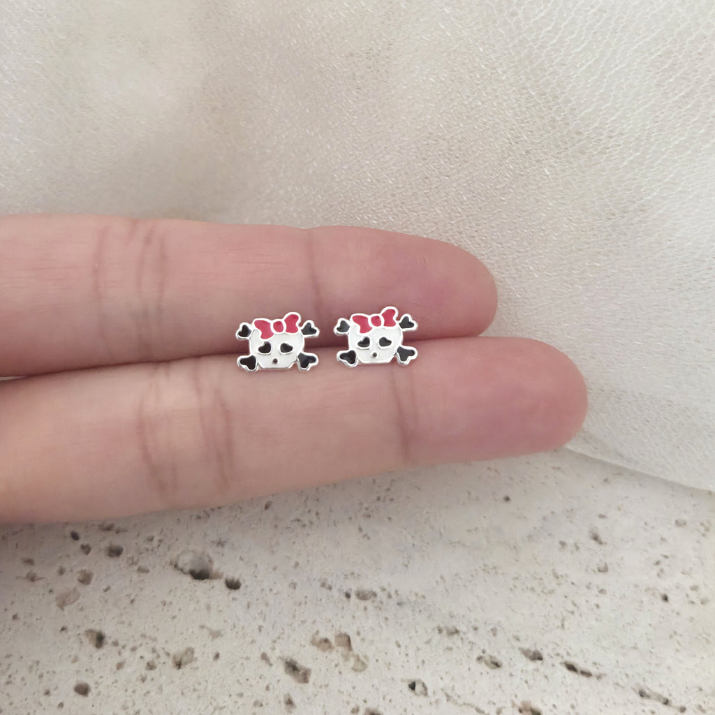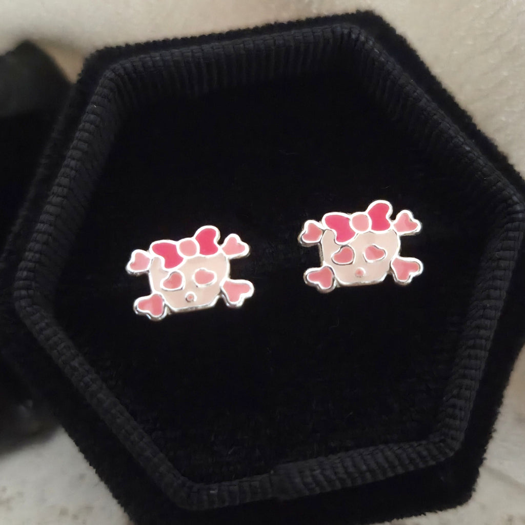 Pink Skull with Ribbon Stud Earrings in 925 Sterling Silver – Solid Silver Halloween Studs