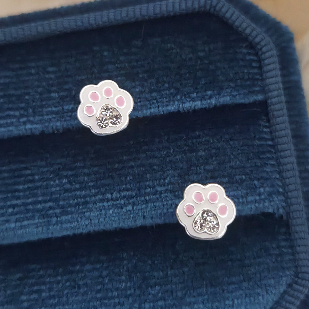 Small Dog Paw Print Stud Earrings in 925 Sterling Silver – Solid Silver Pink & White Cat Paw Studs with Heart Crystal – Cute Pet Jewelry