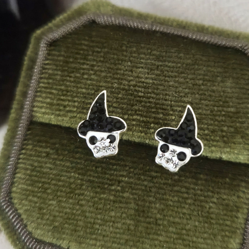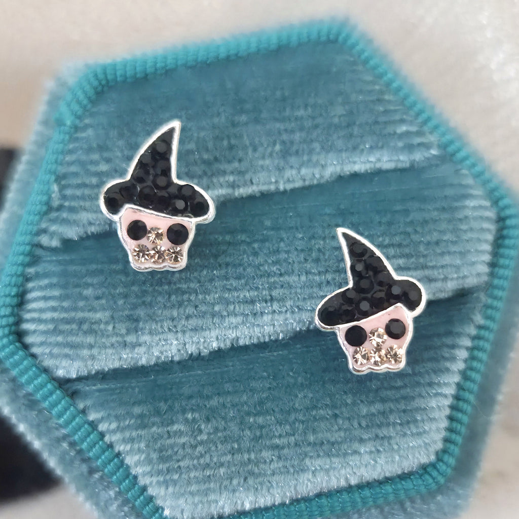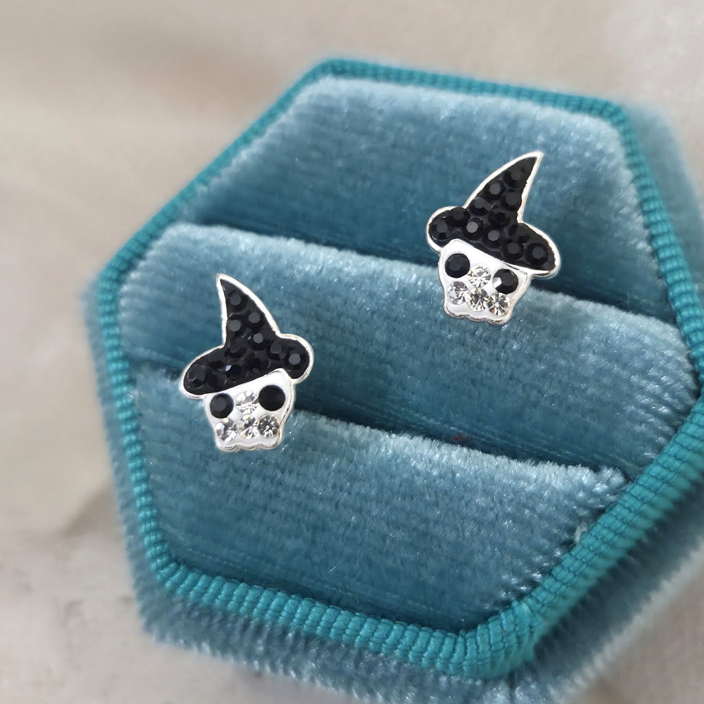 Mini Cute Skull with Black Hat Stud Earrings in 925 Sterling Silver – Solid Silver Halloween Studs with Crystals