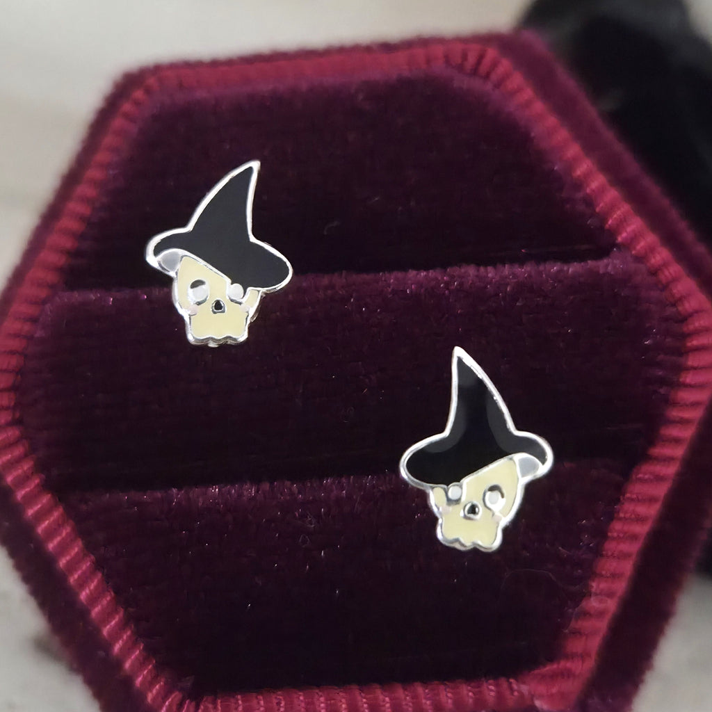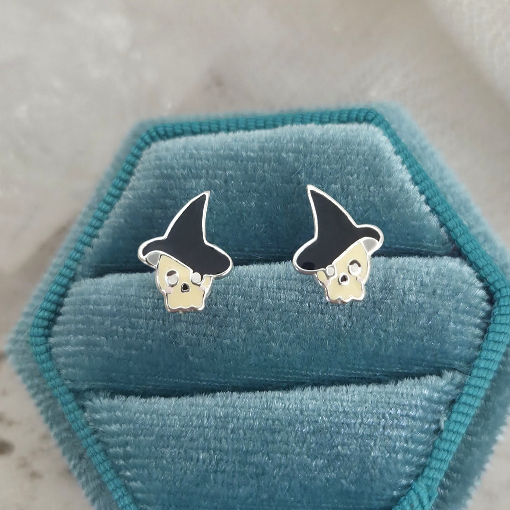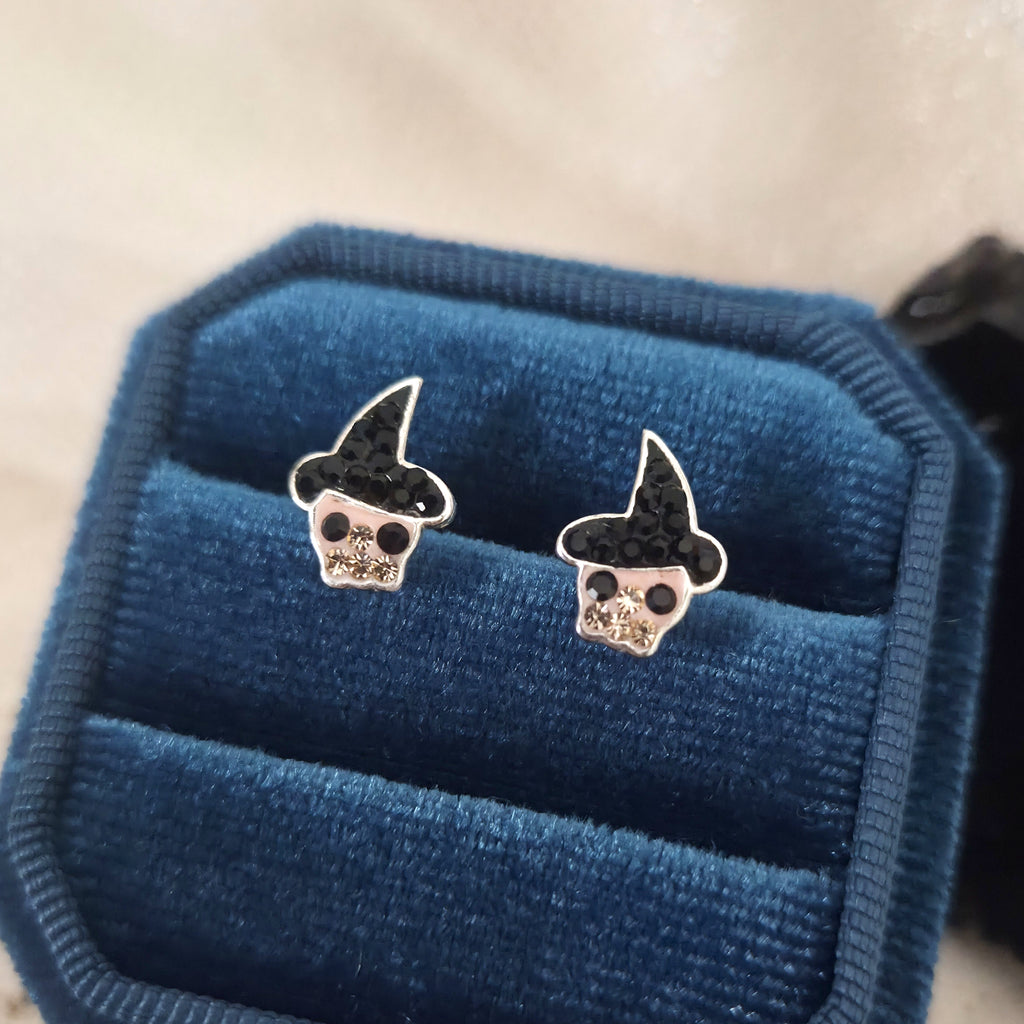 Mini Cute Skull with Black Hat Stud Earrings in 925 Sterling Silver – Solid Silver Halloween Studs with Crystals
