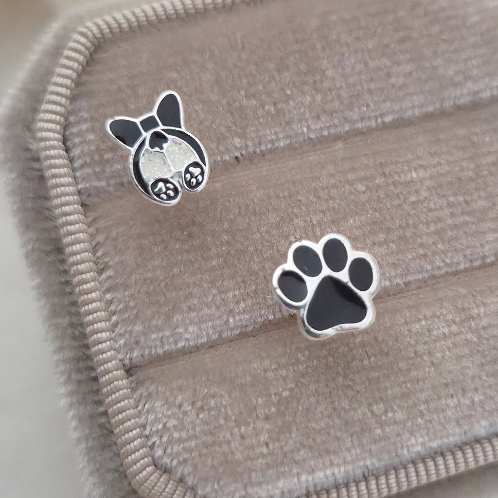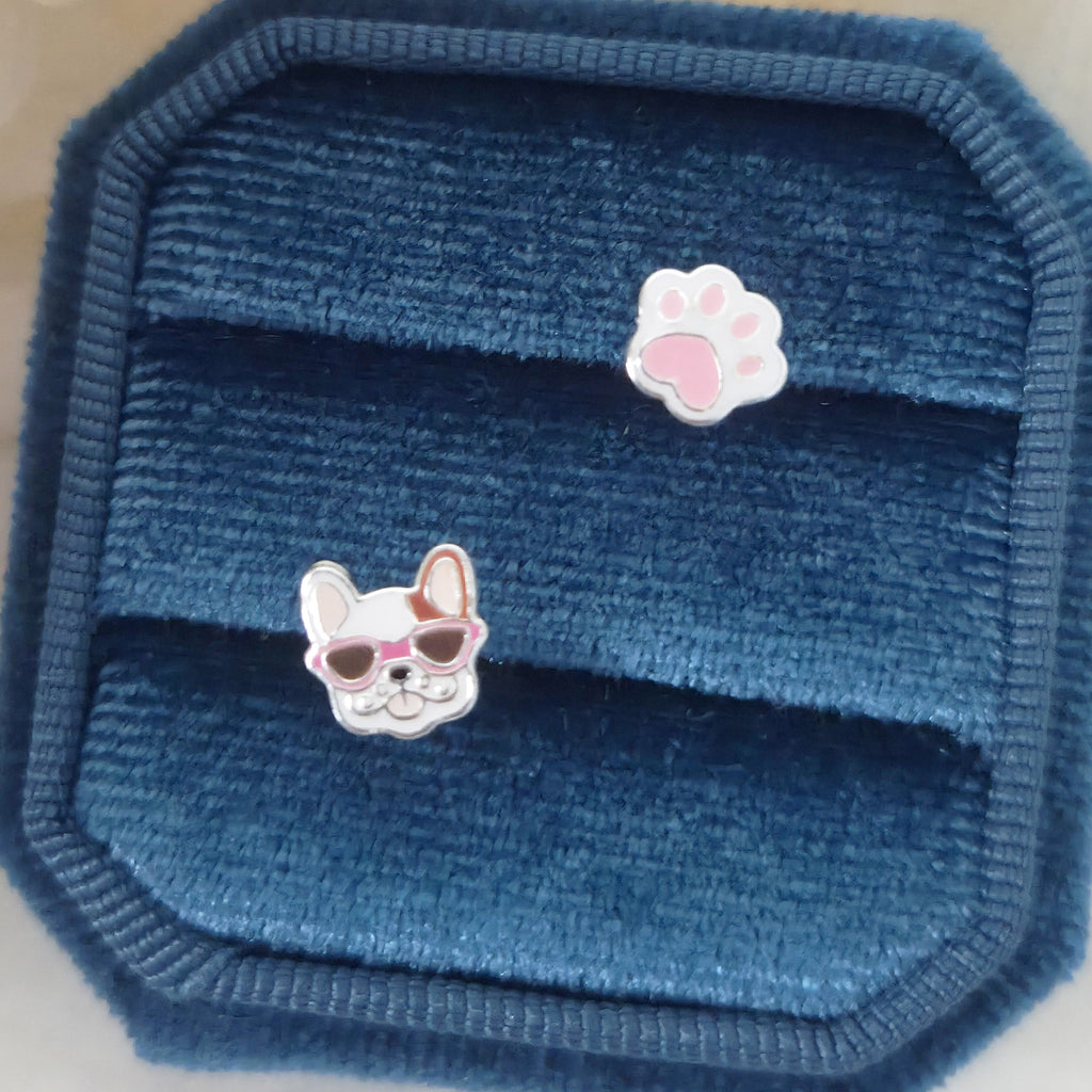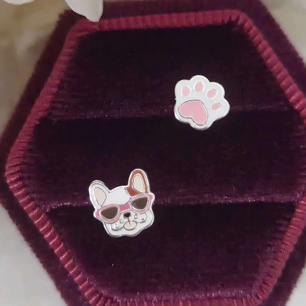 Mismatched Pink French Bulldog & Paw Stud Earrings in 925 Sterling Silver – Solid Silver Pet Lover Jewelry with Enamel