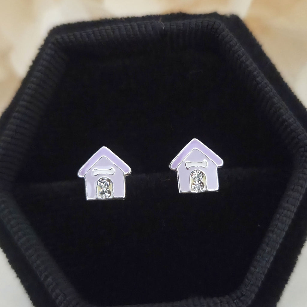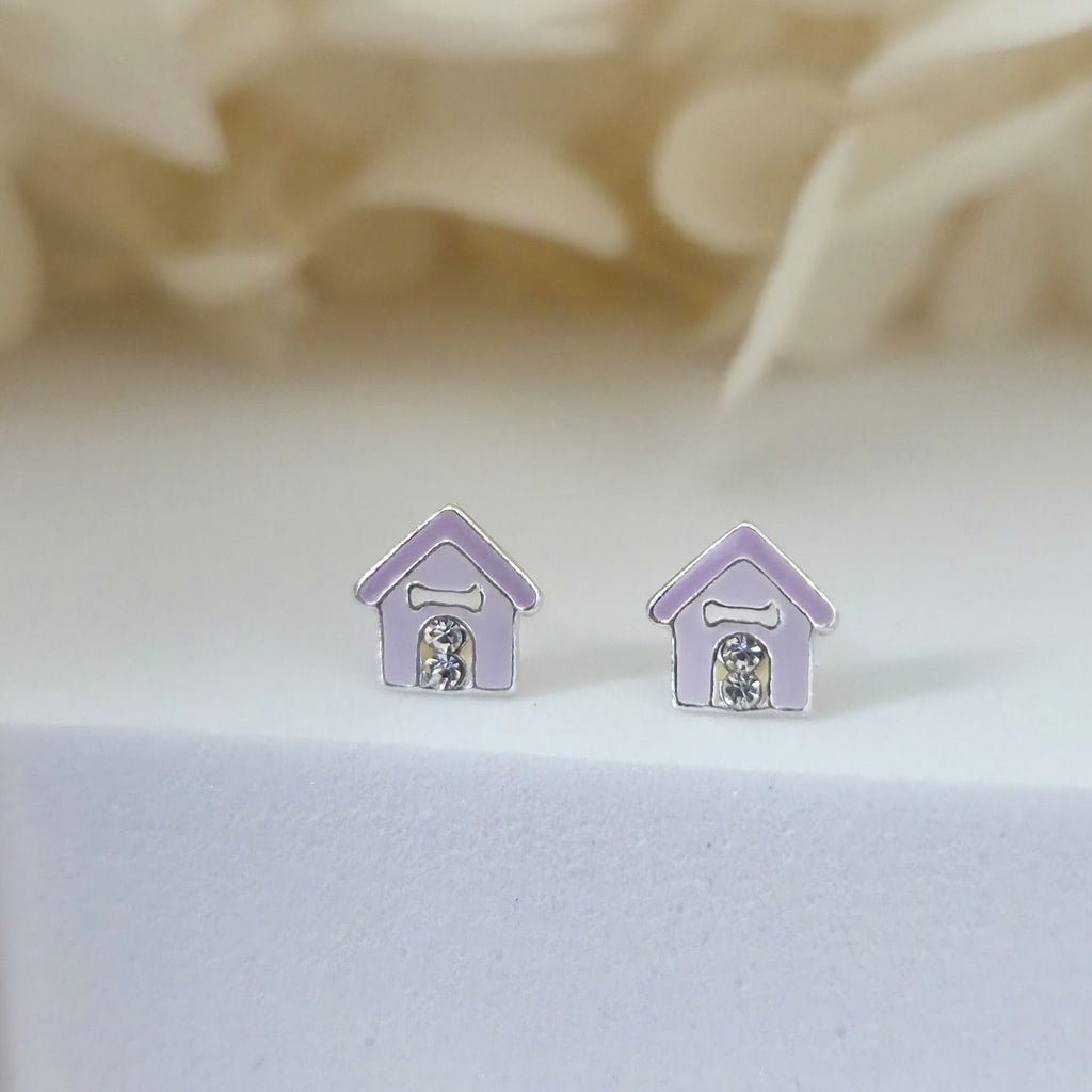 Dog House Stud Earrings in 925 Sterling Silver – Solid Silver Purple Puppy House Studs with Enamel & Sparkling Crystals