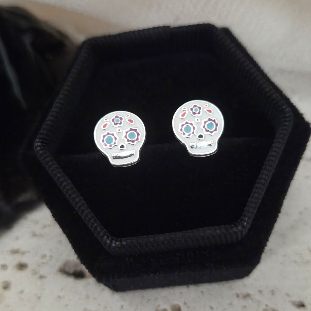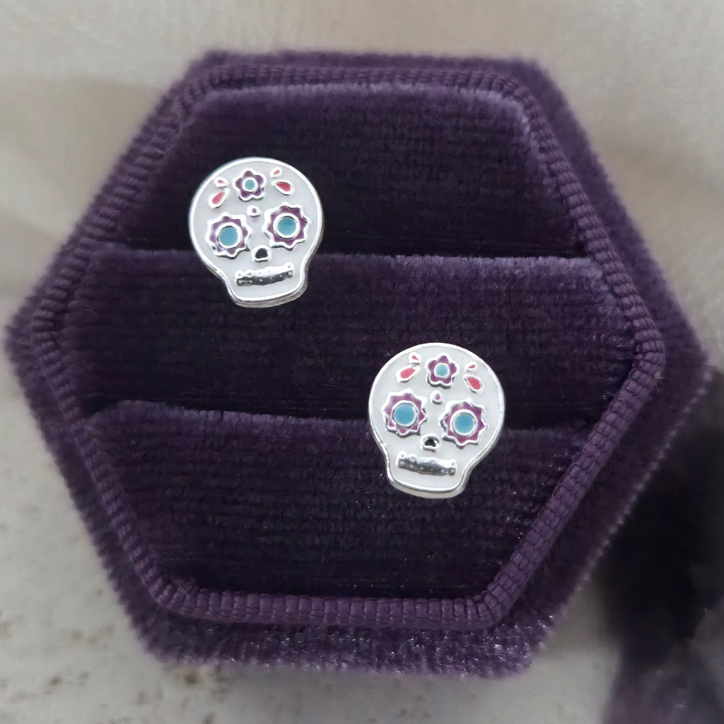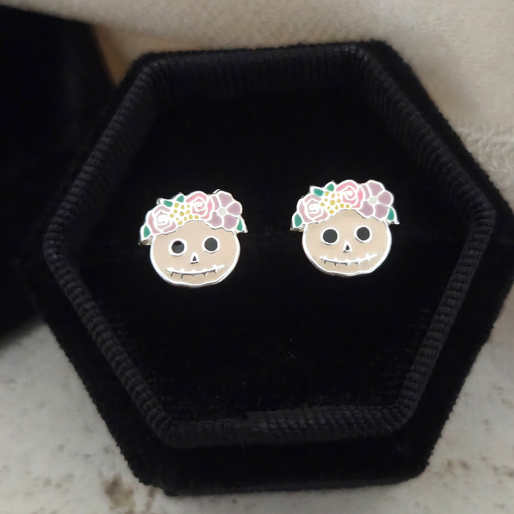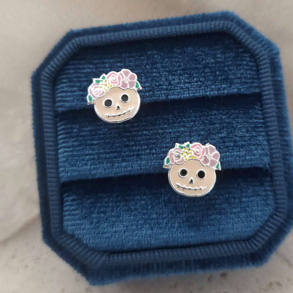 Flower Skull Stud Earrings in 925 Sterling Silver – Solid Silver Halloween Studs with Enamel