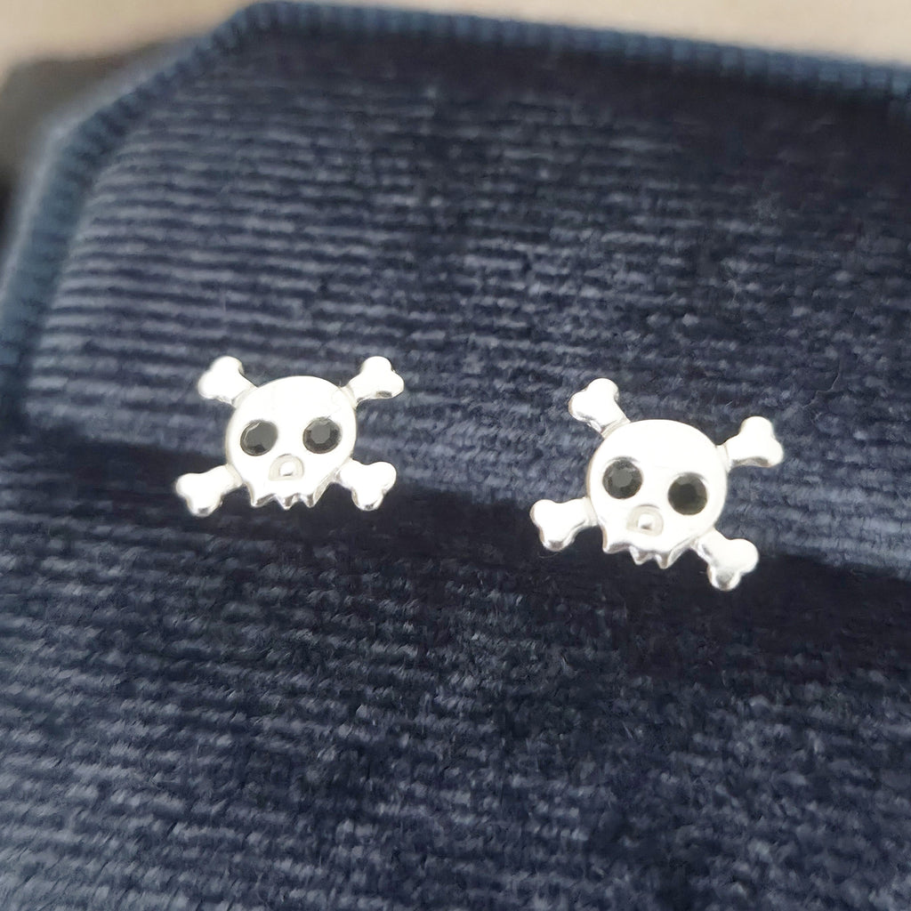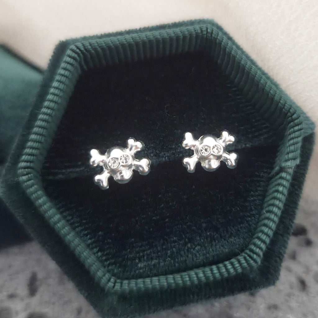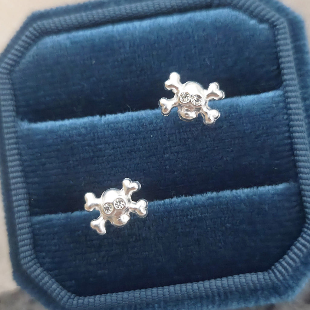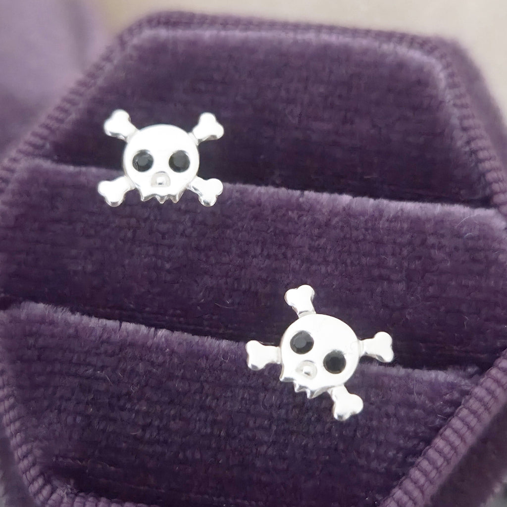 Tiny Skull Stud Earrings in 925 Sterling Silver – Solid Silver Halloween Studs with Crystals