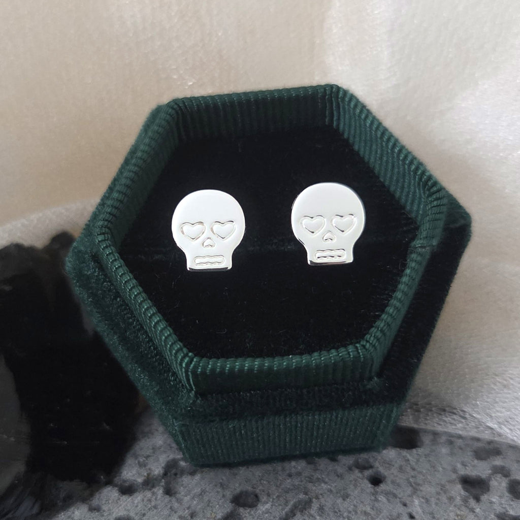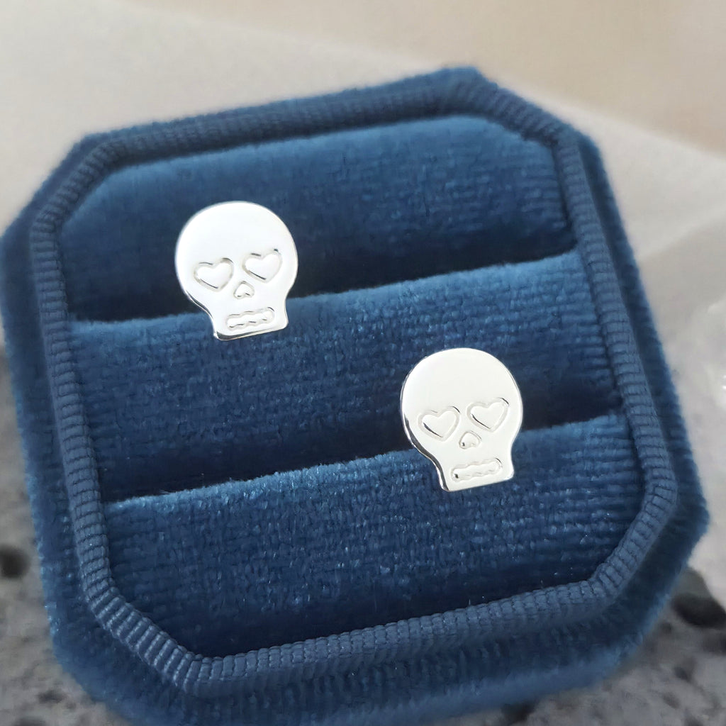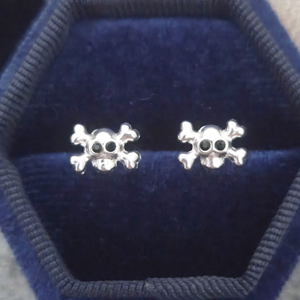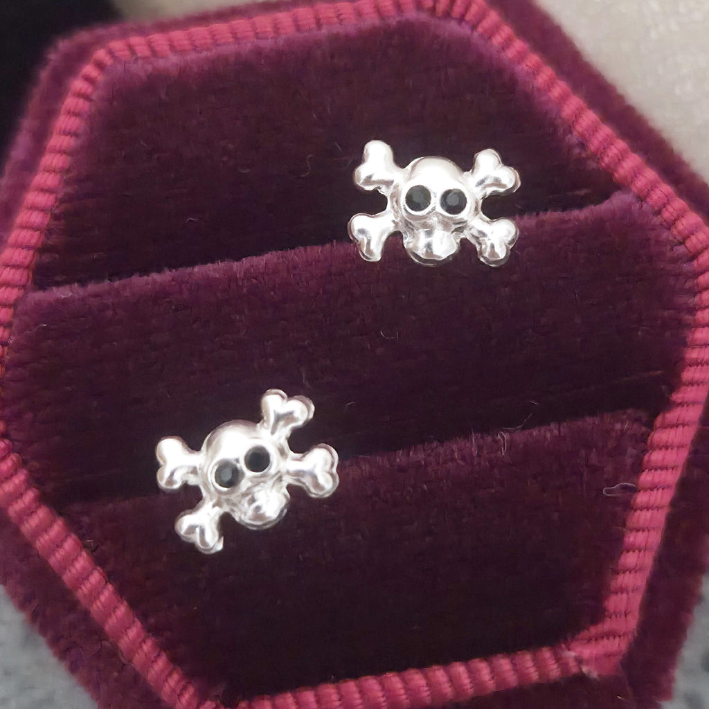 Tiny Skull Stud Earrings in 925 Sterling Silver – Solid Silver Halloween Studs with Crystals