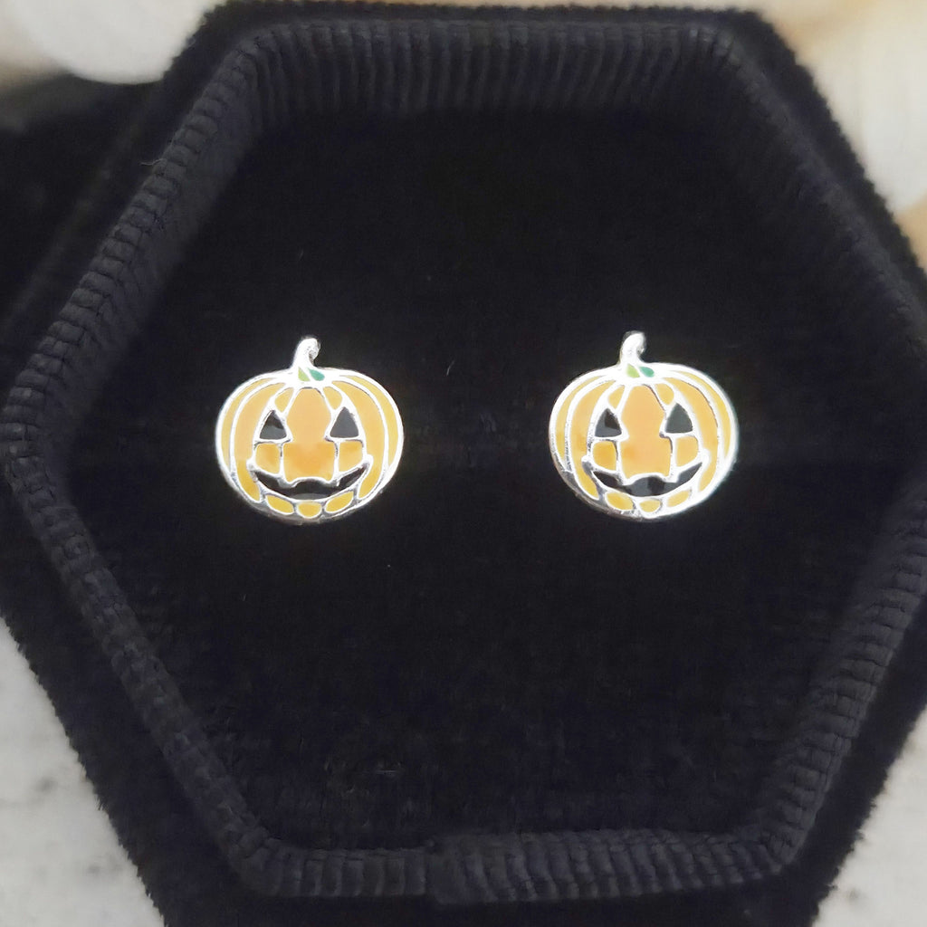 Light Orange Pumpkin Stud Earrings in 925 Sterling Silver – Solid Silver Halloween Studs with Enamel