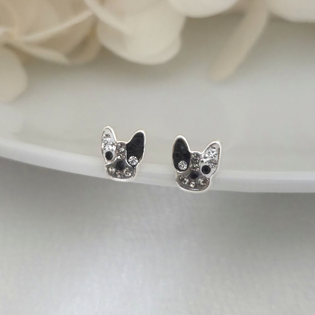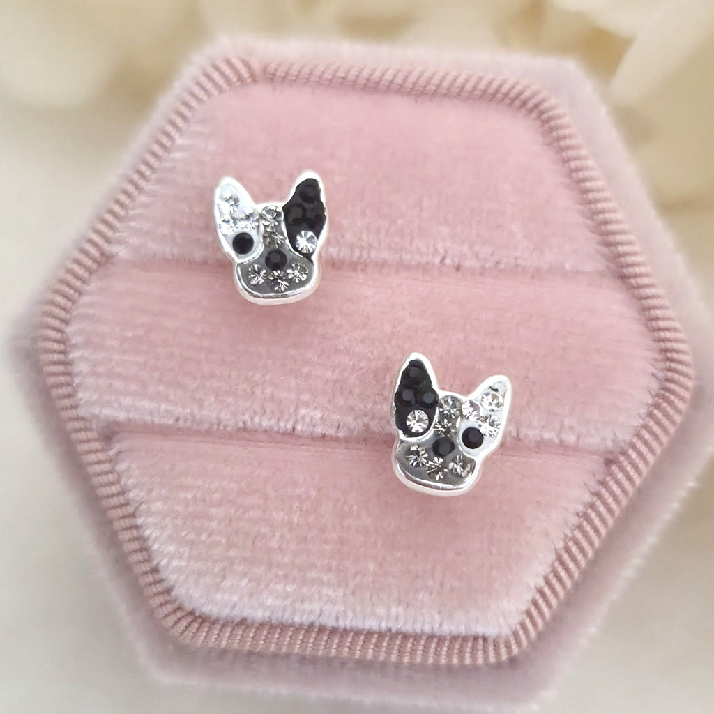 French Bulldog Stud Earrings in 925 Sterling Silver – Solid Silver Black & White Dog Studs with Enamel and Sparkling Crystal