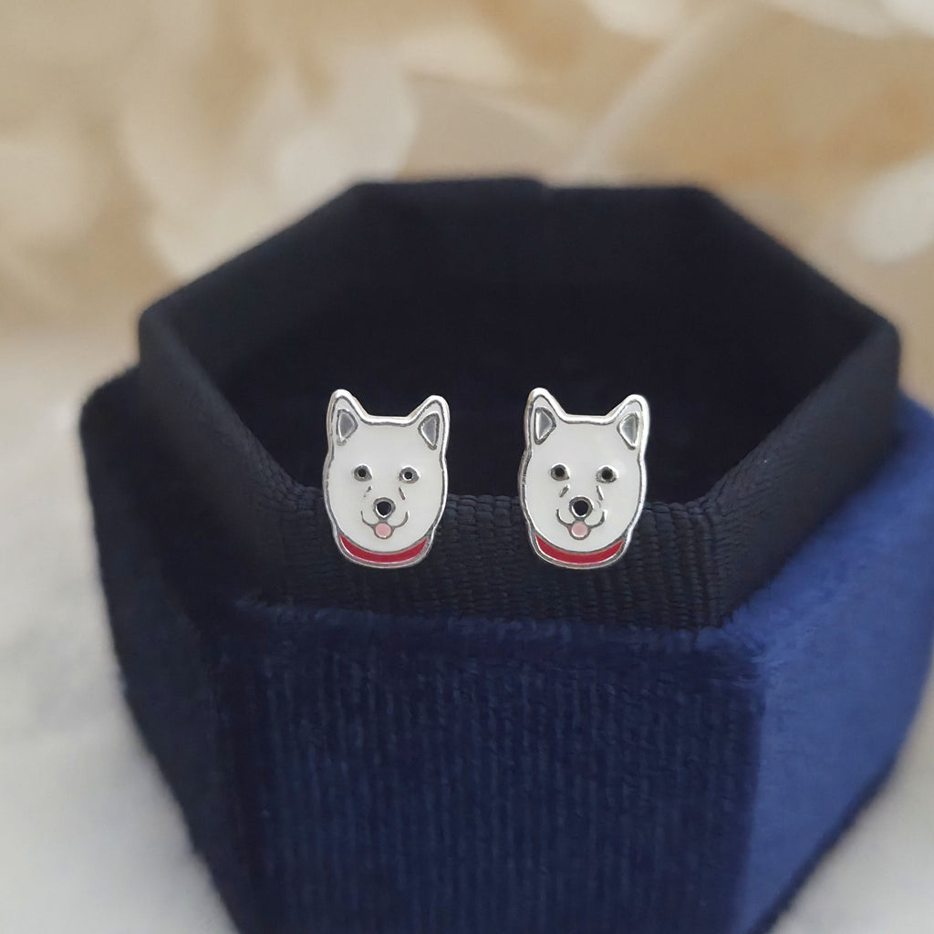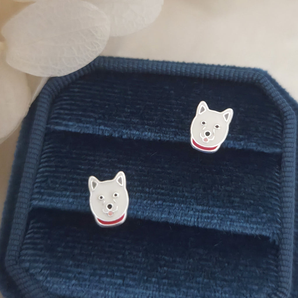 Husky Dog Stud Earrings in 925 Sterling Silver – Solid Silver White Puppy Studs with Enamel – Cute Pet Lover Jewelry Gift