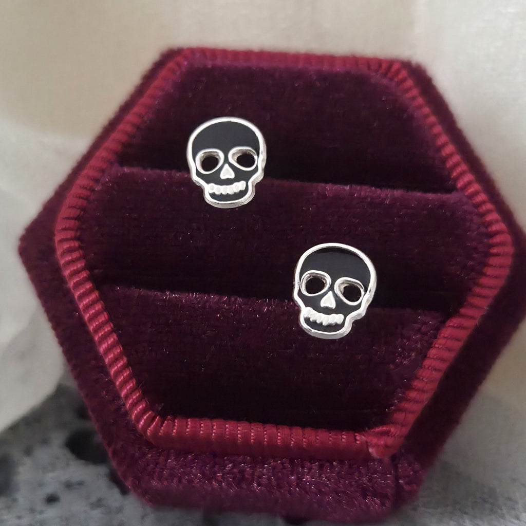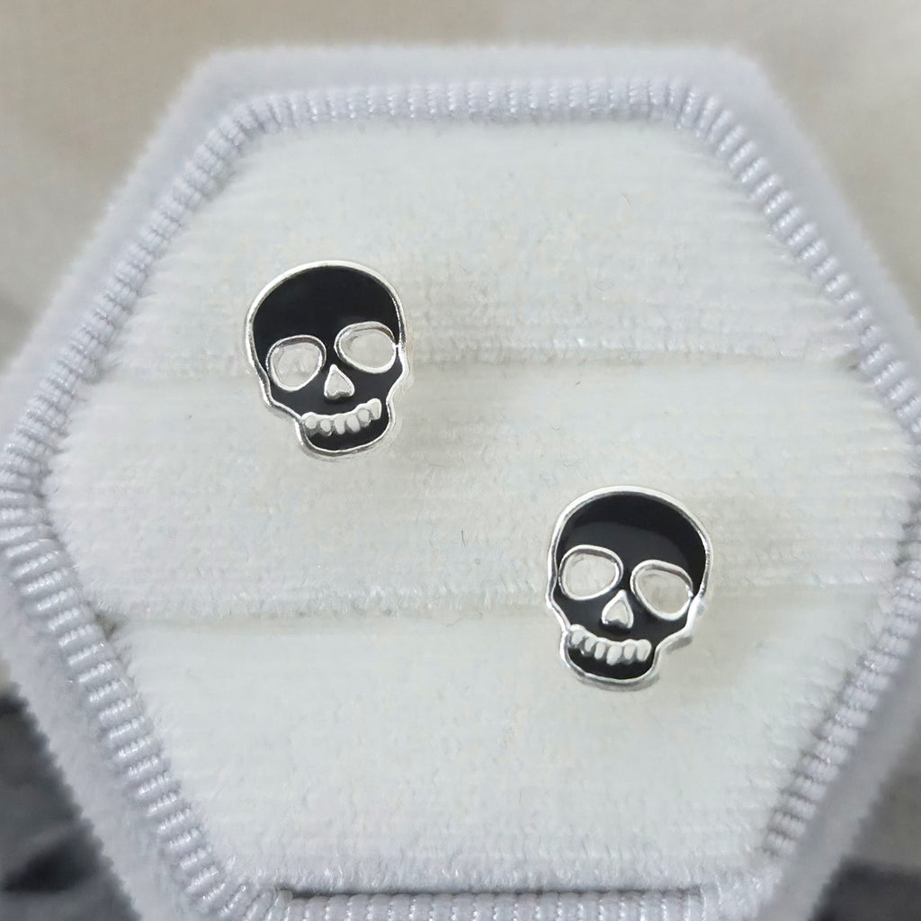 Black Ghost Skull Stud Earrings in 925 Sterling Silver – Solid Silver Halloween Studs with Enamel