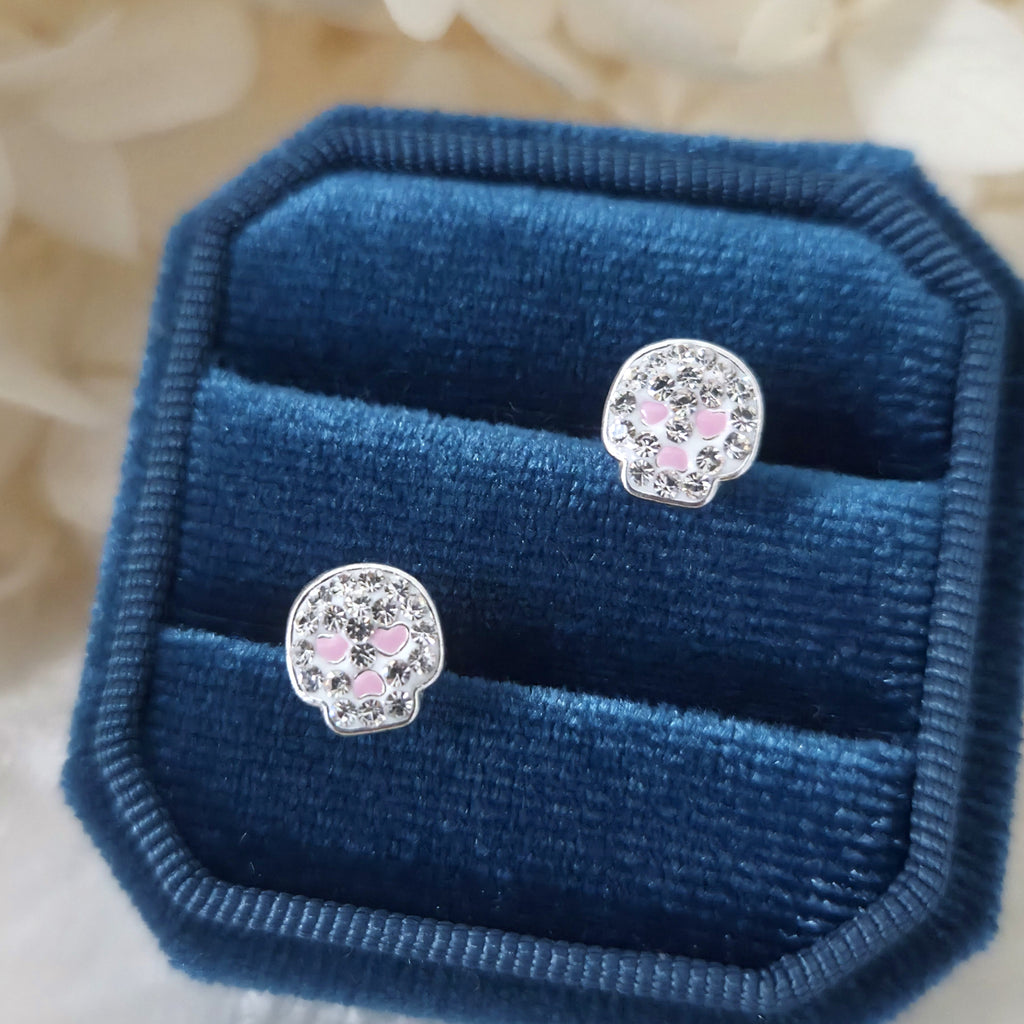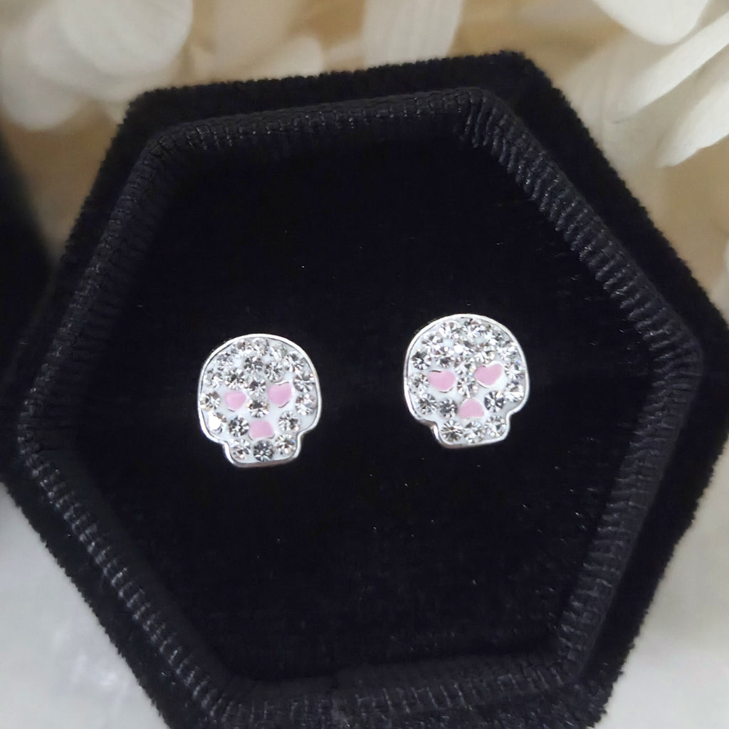 White & Pink Skull Stud Earrings in 925 Sterling Silver – Solid Silver Halloween Studs with Sparkling Crystals