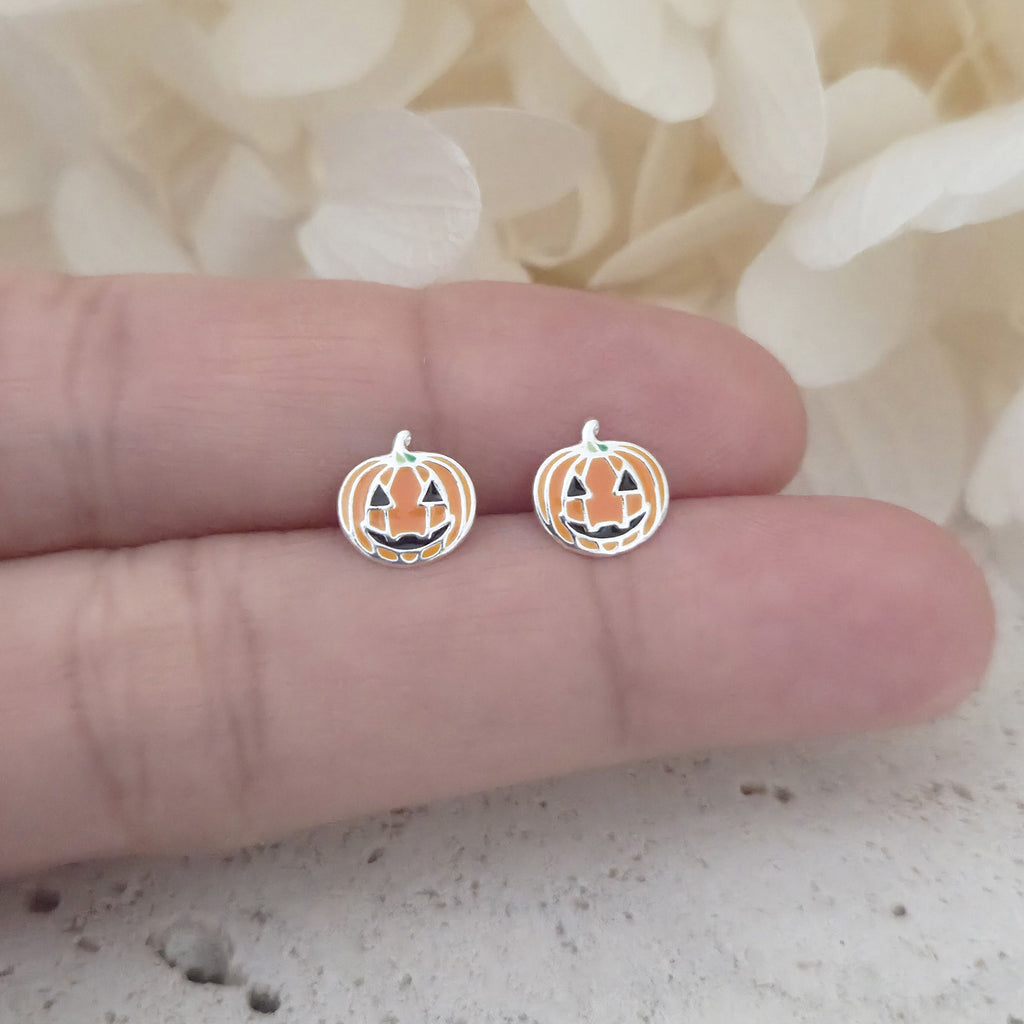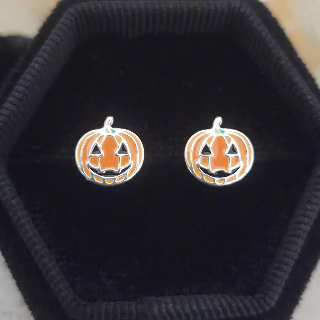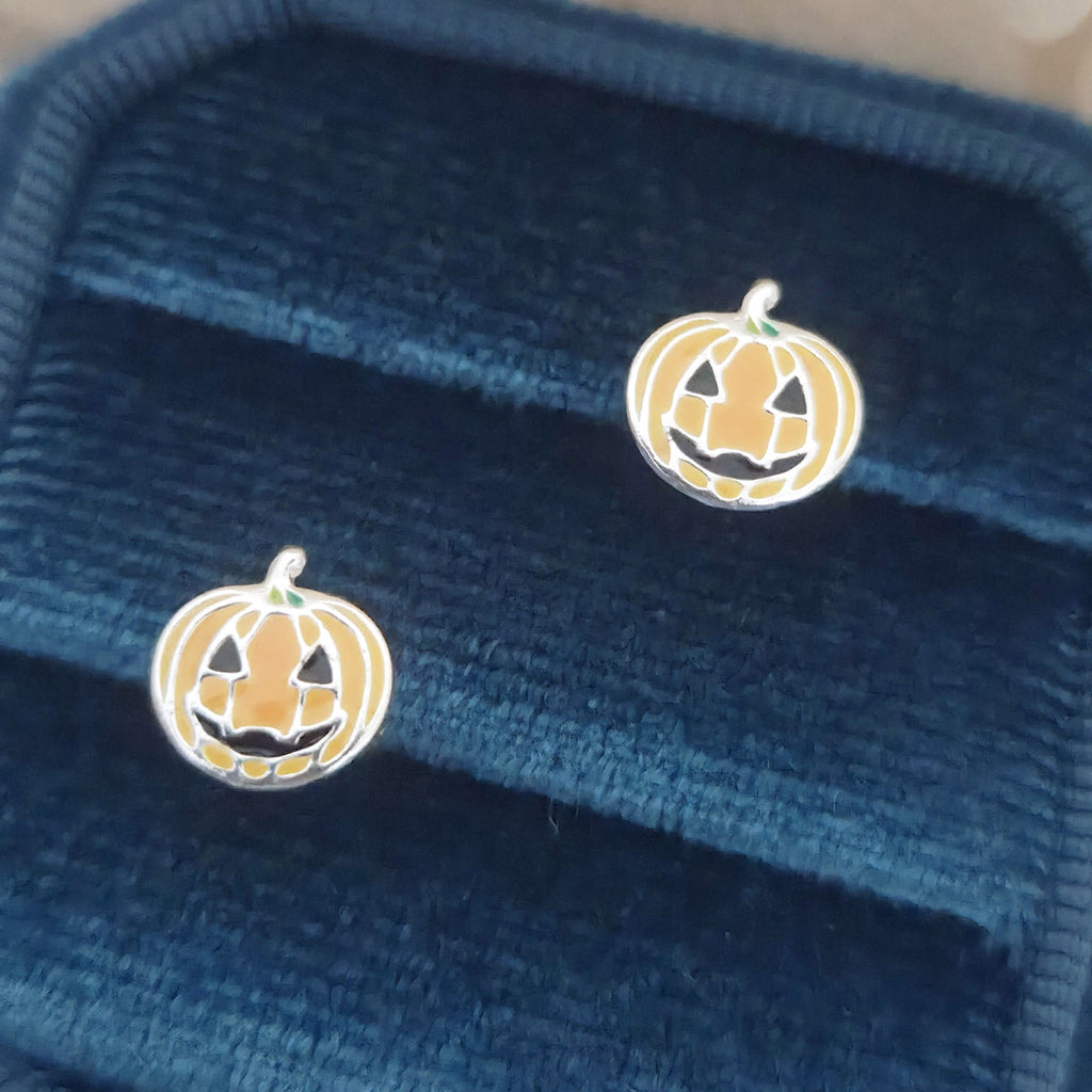 Orange Ghost Pumpkin Stud Earrings in 925 Sterling Silver – Solid Silver Halloween Studs with Enamel