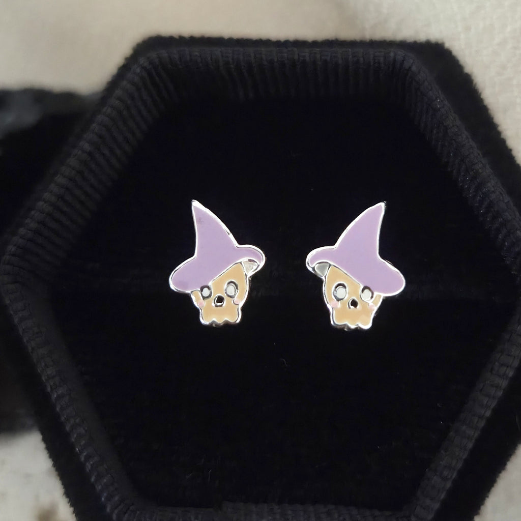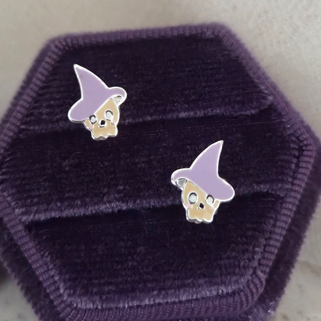 Tiny Ghost Skull with Purple Hat Stud Earrings in 925 Sterling Silver – Solid Silver Halloween Studs with Enamel