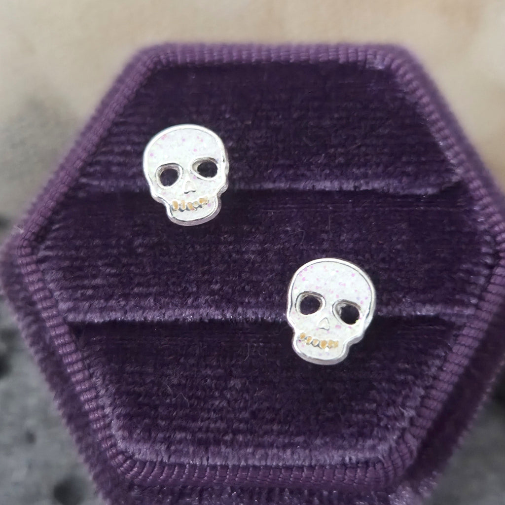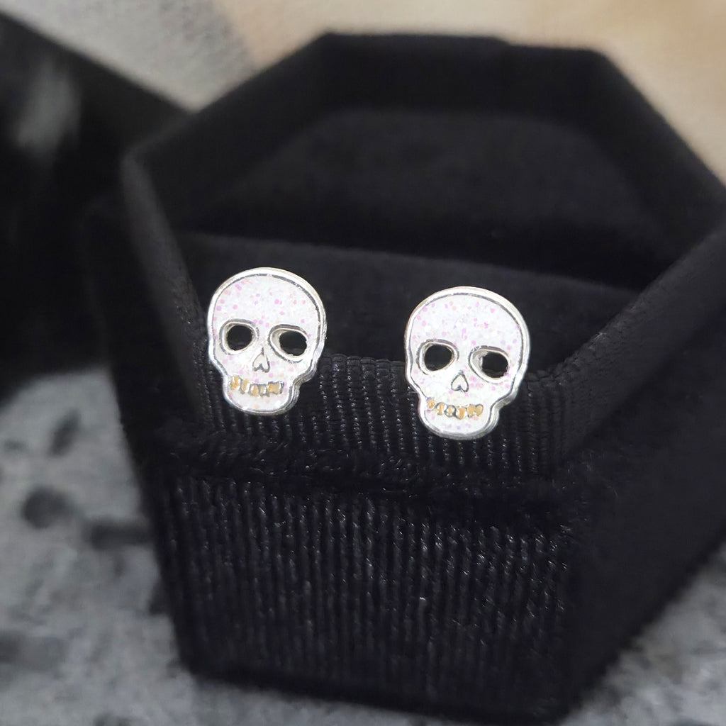 White Skull Stud Earrings in 925 Sterling Silver – Solid Silver Halloween Studs with Enamel
