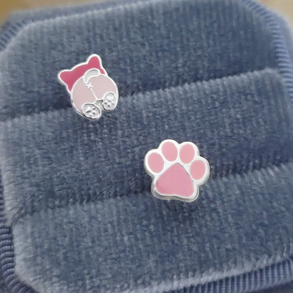 Mismatched Pink Dog & Paw Stud Earrings in 925 Sterling Silver – Solid Silver Dog Lover Jewelry with Enamel