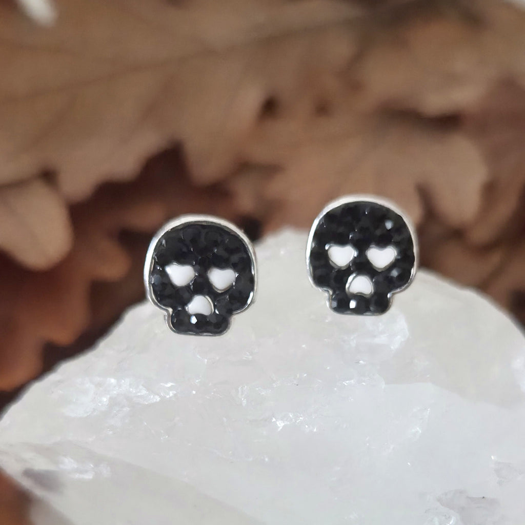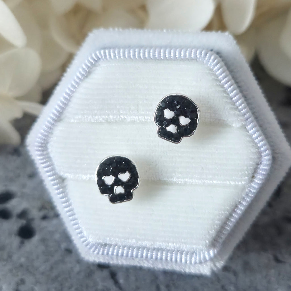 Black Skull Stud Earrings in 925 Sterling Silver – Solid Silver Halloween Studs with Black Crystals