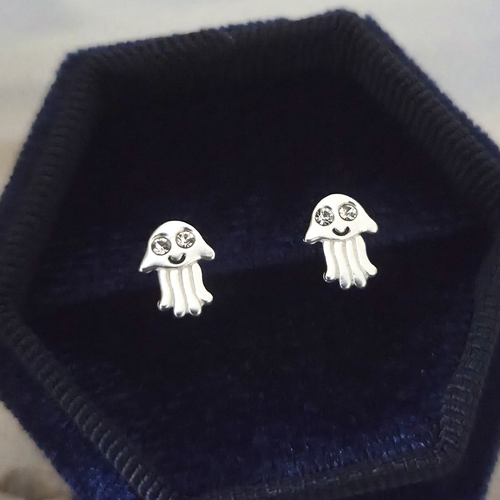 Tiny Jellyfish Stud Earrings in 925 Sterling Silver – Solid Silver Sea Animal Studs with Crystals – Cute Ocean Summer Beach Jewelry