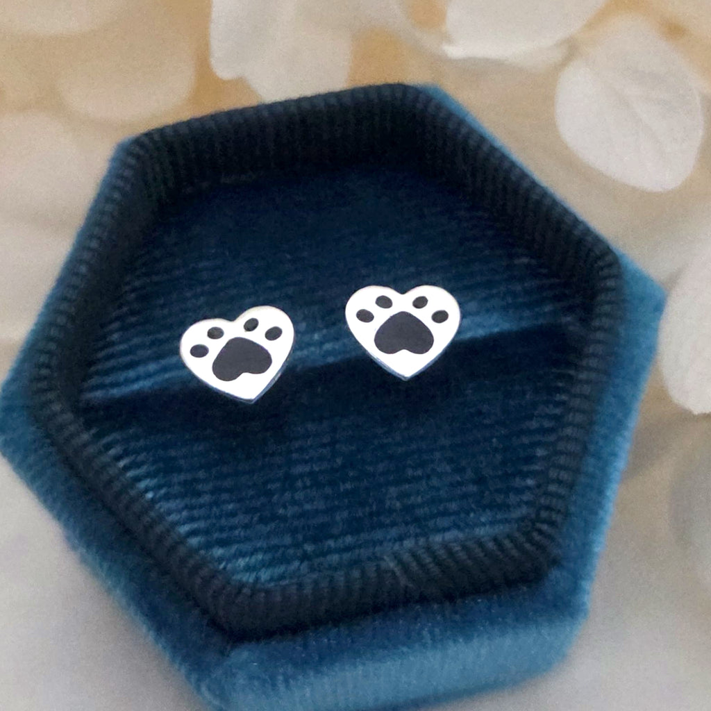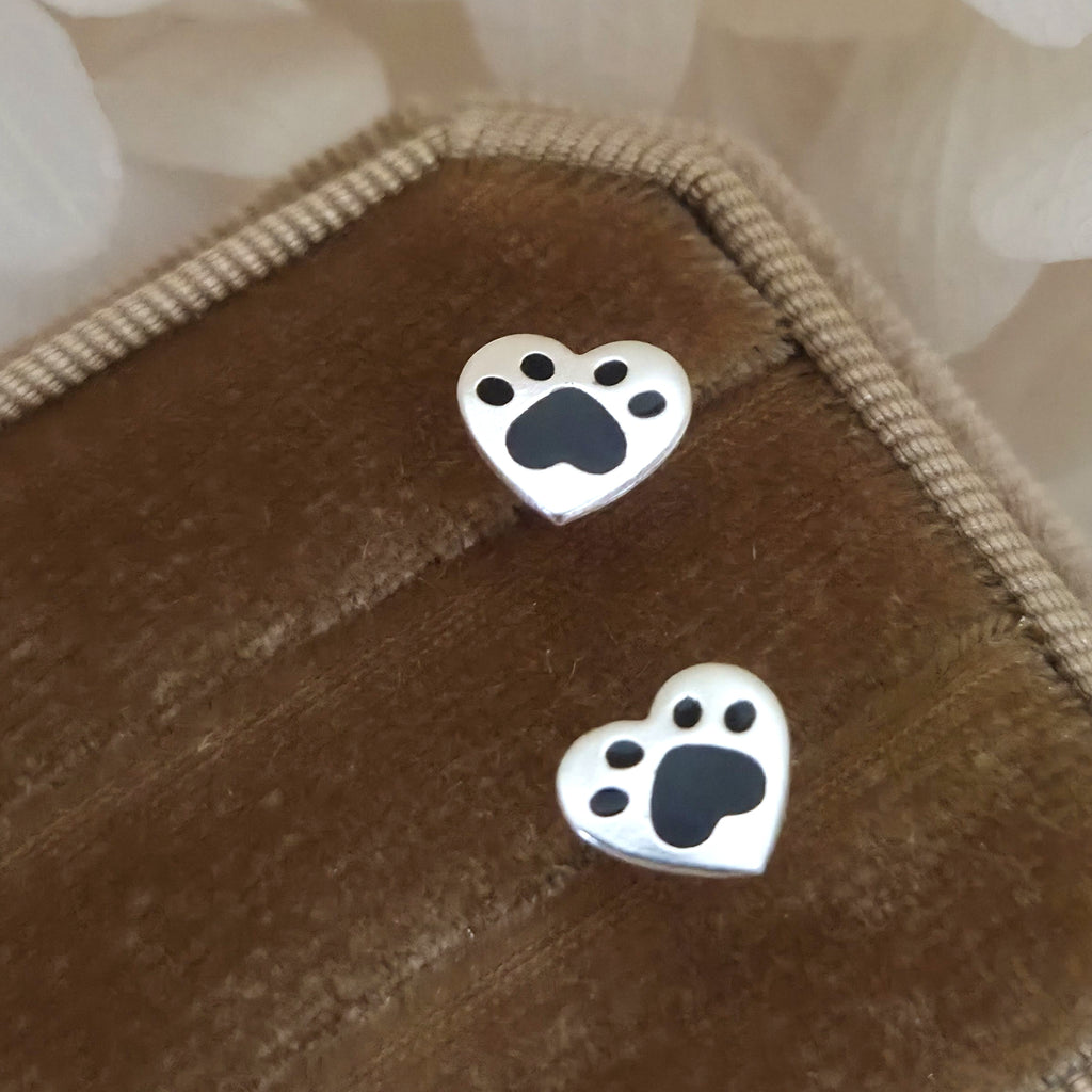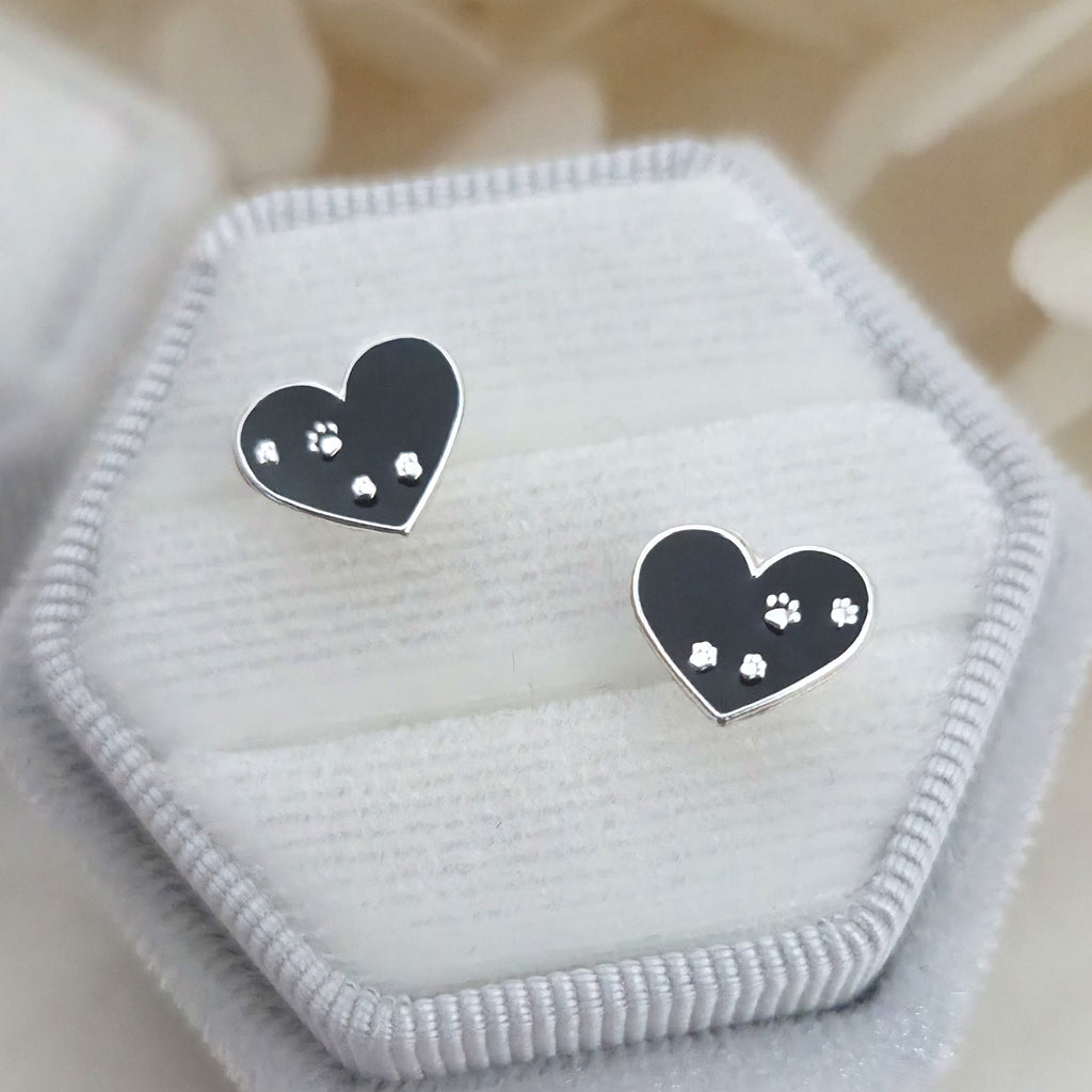 Heart Stud Earrings in 925 Sterling Silver – Solid Silver Heart Studs with Black Paw Print Enamel – Pet Lover Jewelry Gift