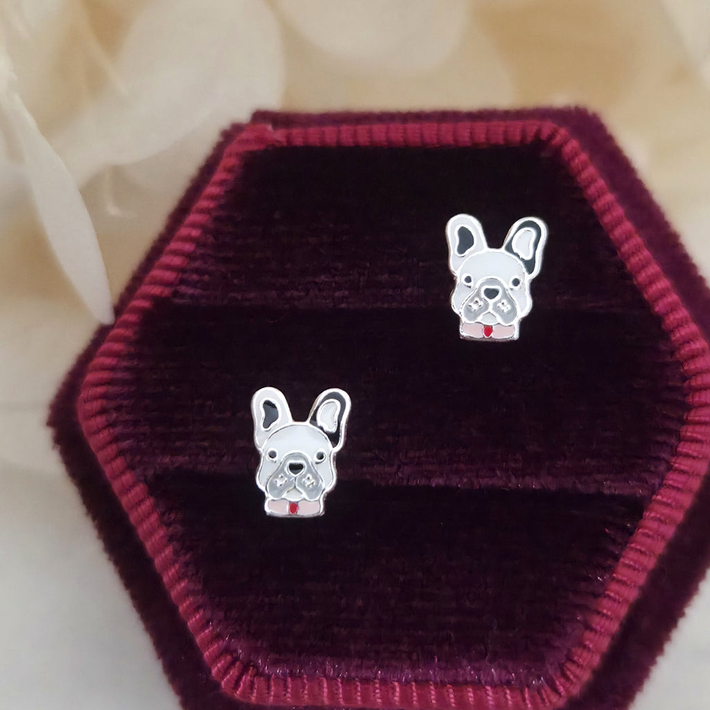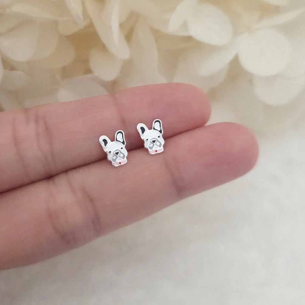 French Bulldog Stud Earrings in 925 Sterling Silver – Solid Silver Black & White Bulldog Studs with Enamel – Cute Pet Lover Jewelry