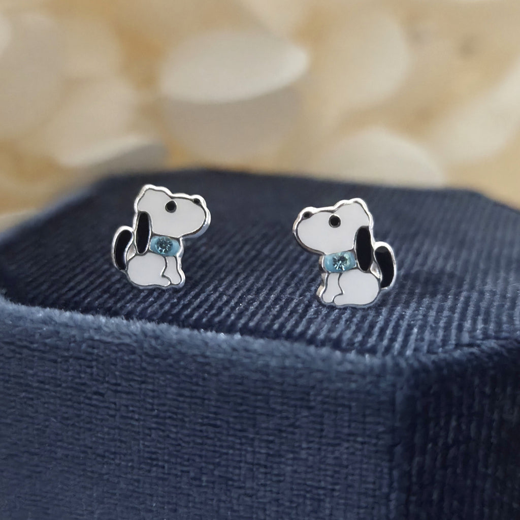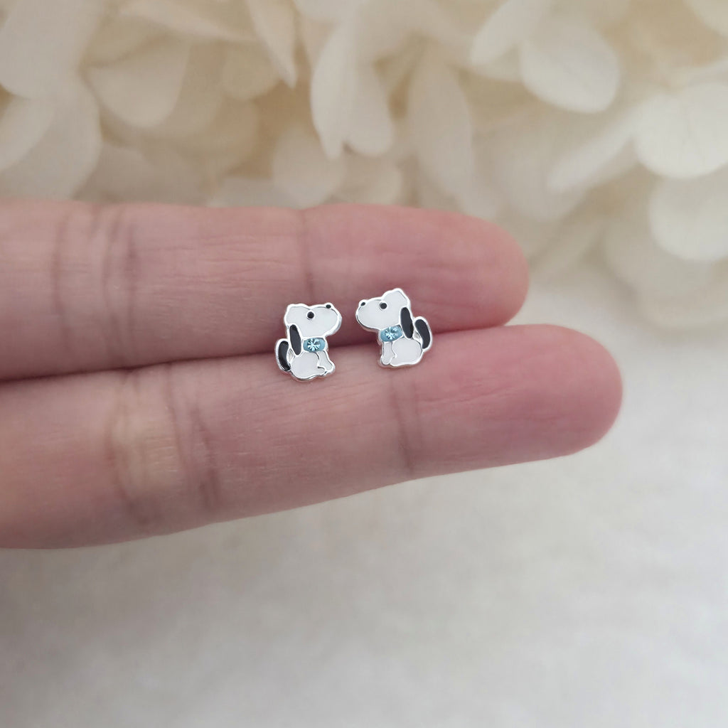 Cute Dog Stud Earrings in 925 Sterling Silver – Solid Silver White Puppy Studs with Enamel & Sparkling Crystals