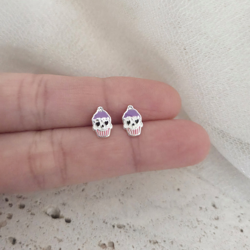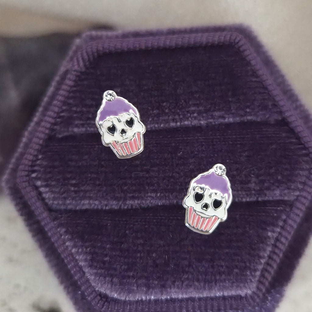 Mini Purple & Pink Halloween Cupcake Stud Earrings in 925 Sterling Silver – Solid Silver Colorful Skull Studs