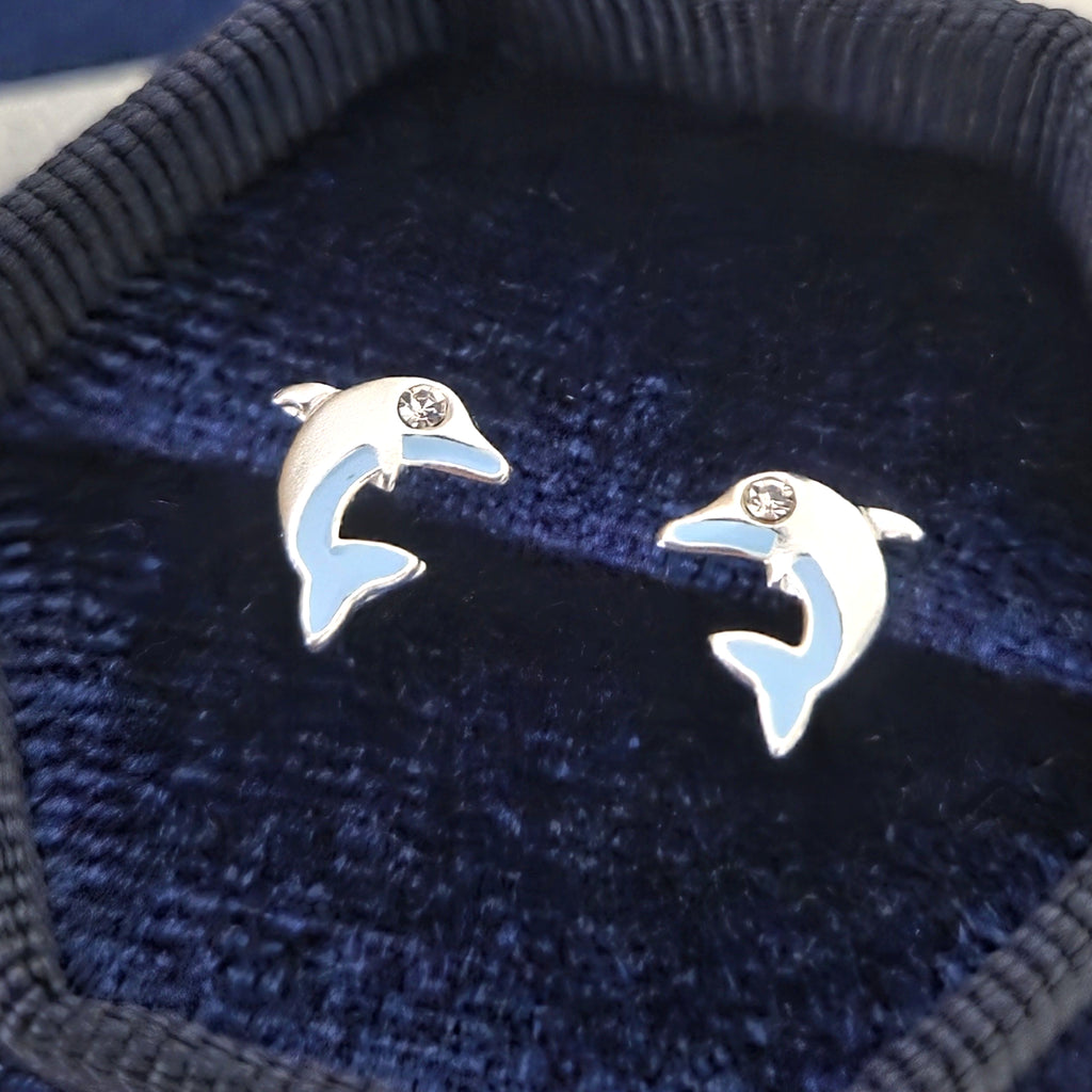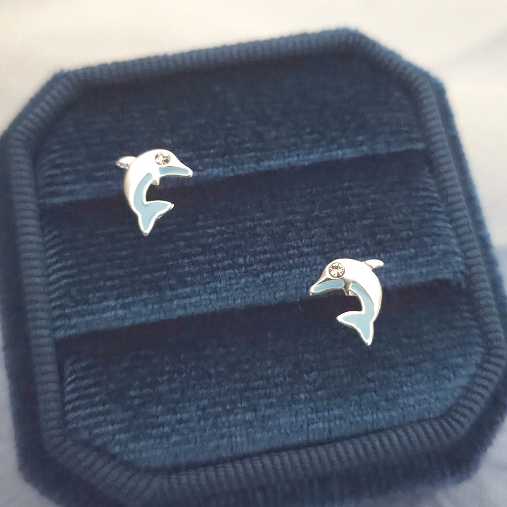 Tiny 925 Sterling Silver Dolphin Stud Earrings – Minimalist Solid Silver Blue Dolphin Studs – Cute Ocean Sea Animal Jewelry Gift