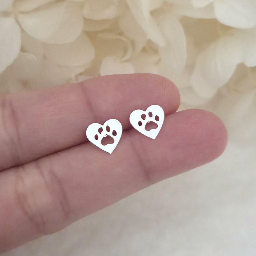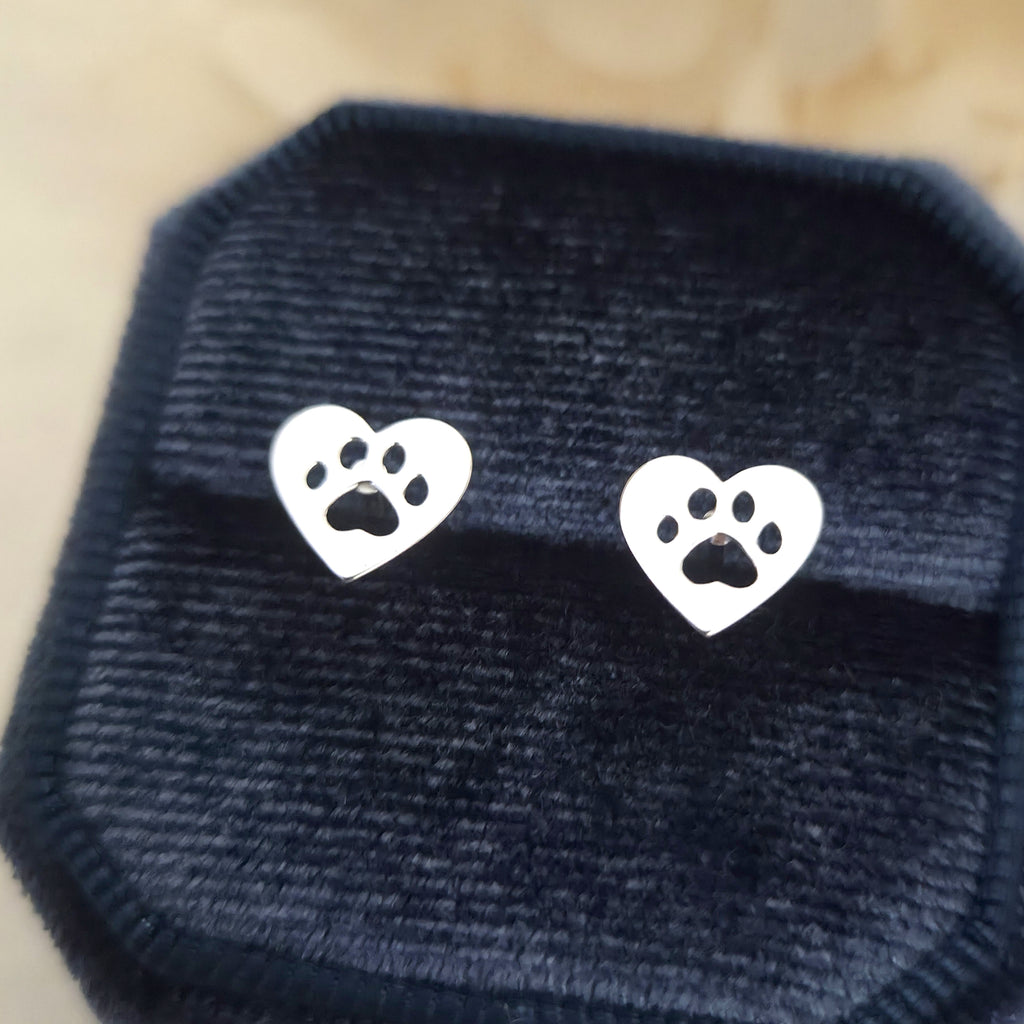 925 Sterling Silver Dog Paw Print in Heart Stud Earrings – Cat Paw Print Heart Shaped Studs in Solid Silver – Pet Lover Jewelry Gift