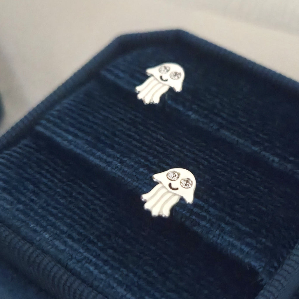 White Ghost Skull Stud Earrings in 925 Sterling Silver – Solid Silver Halloween Studs with Enamel