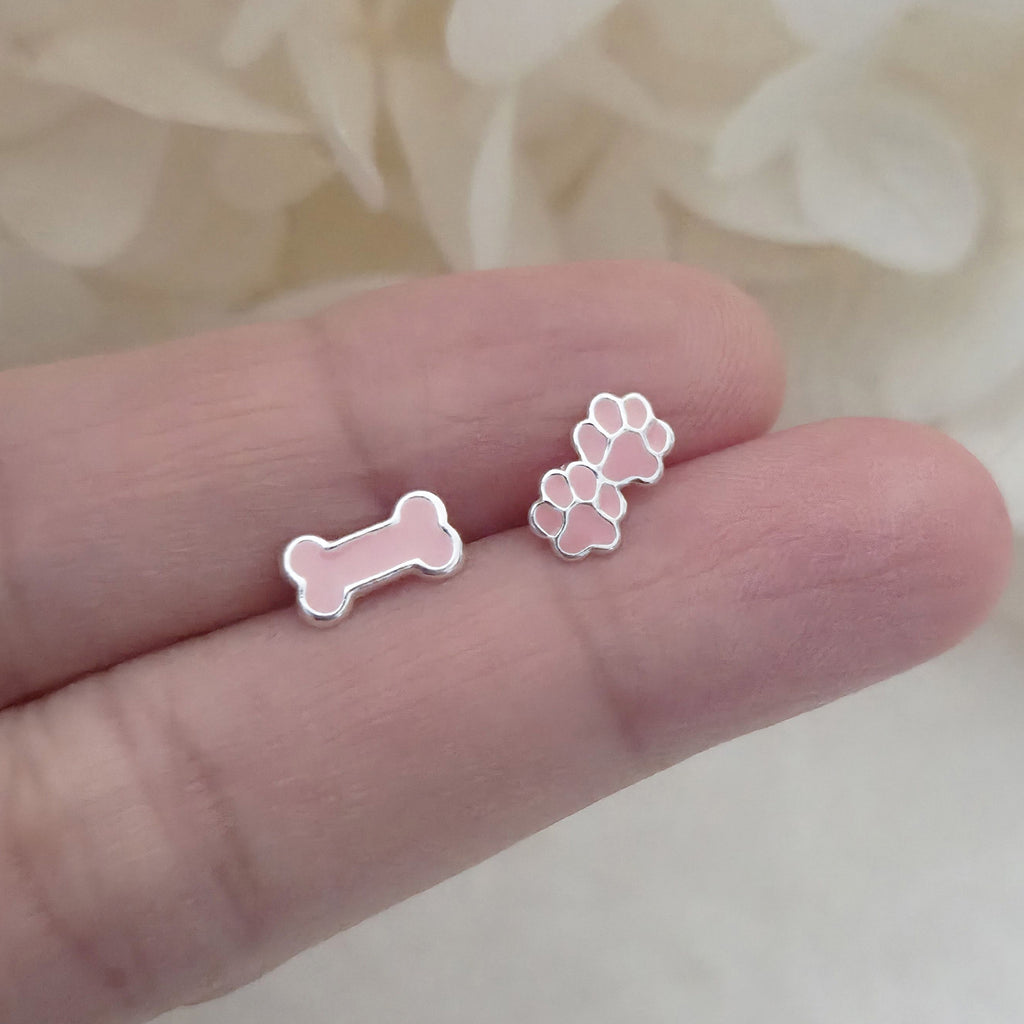 Tiny Pink Bone & Paw Stud Earrings in 925 Sterling Silver – Solid Silver Dog Lover Jewelry with Enamel