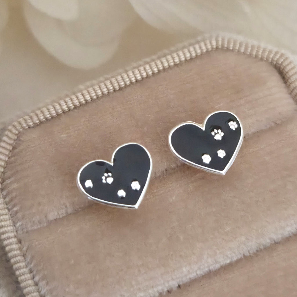 Black Paw Print Heart Stud Earrings in 925 Sterling Silver – Heart Shaped Studs with Black Enamel & Paw Print