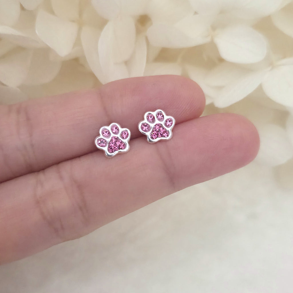 925 Sterling Silver Dog Paw Print Stud Earrings – Pink Paw Studs in Solid Silver with Rose Crystal – Cute Pet Lover Jewelry