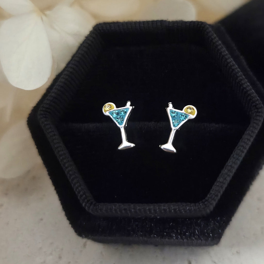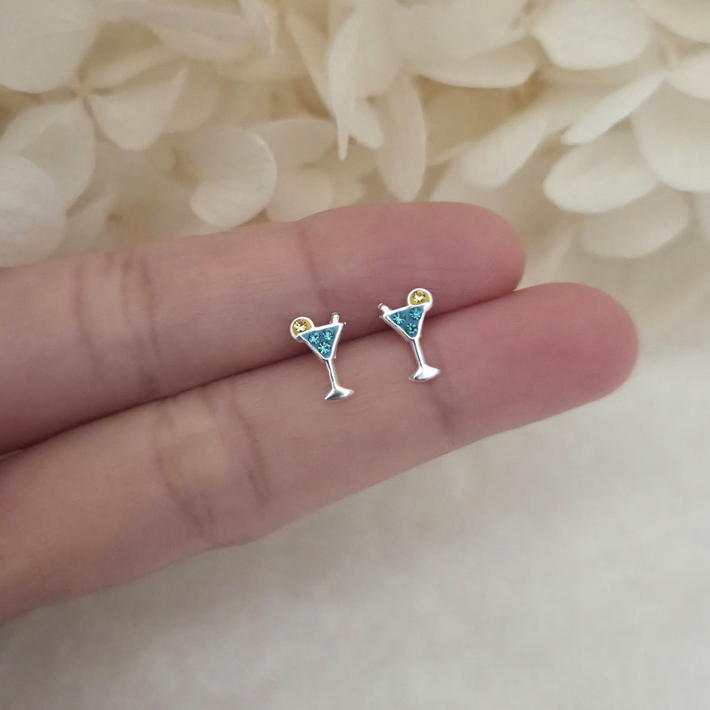 Blue Cocktail Glass Stud Earrings in 925 Sterling Silver – Summer Beach Drink Studs with Blue Enamel & Crystals
