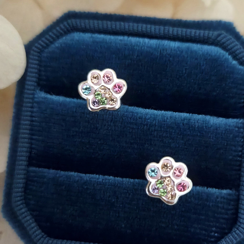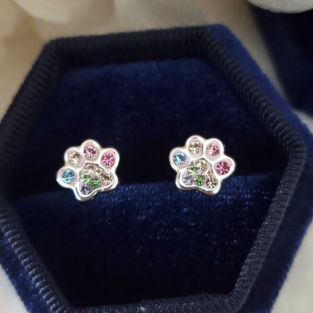 925 Sterling Silver Paw Print Stud Earrings – Rainbow Paw Studs in Solid Silver with Colorful Crystal – Cute Animal Jewelry Gift for Her