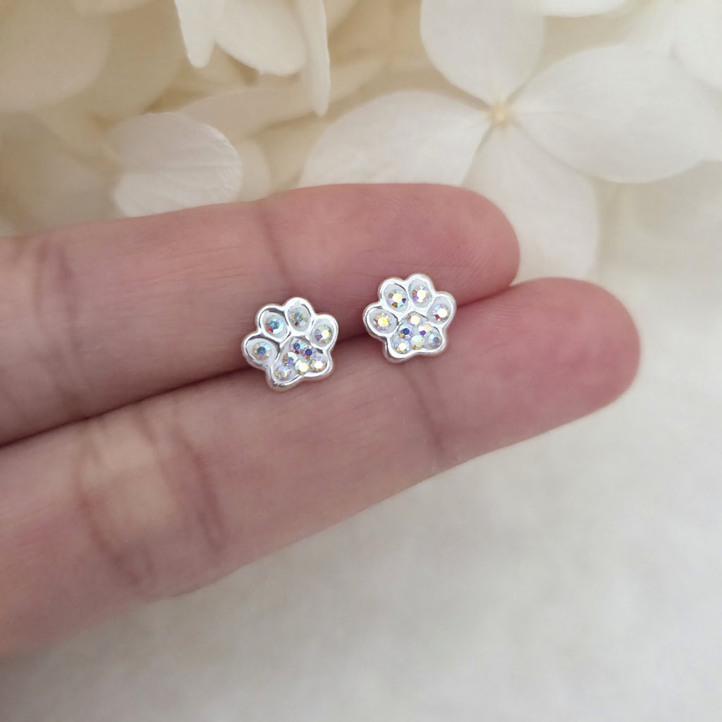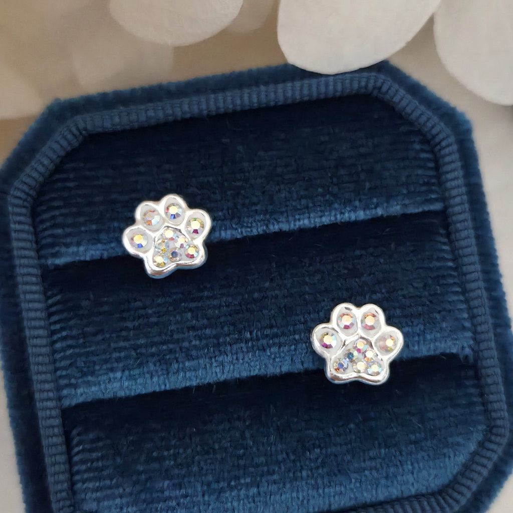 925 Sterling Silver Paw Print Stud Earrings – Dog Paw Studs with Crystal AB Aurora Borealis – Cute Animal Jewelry Gift