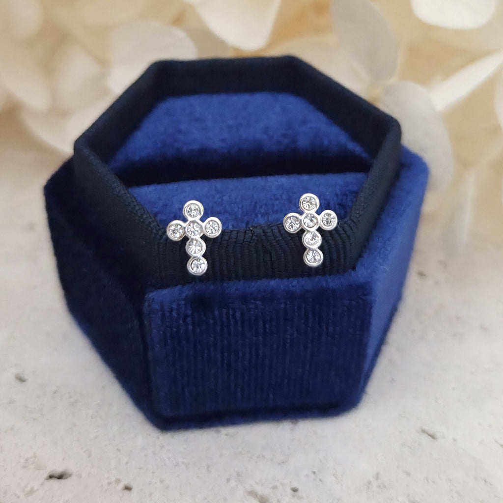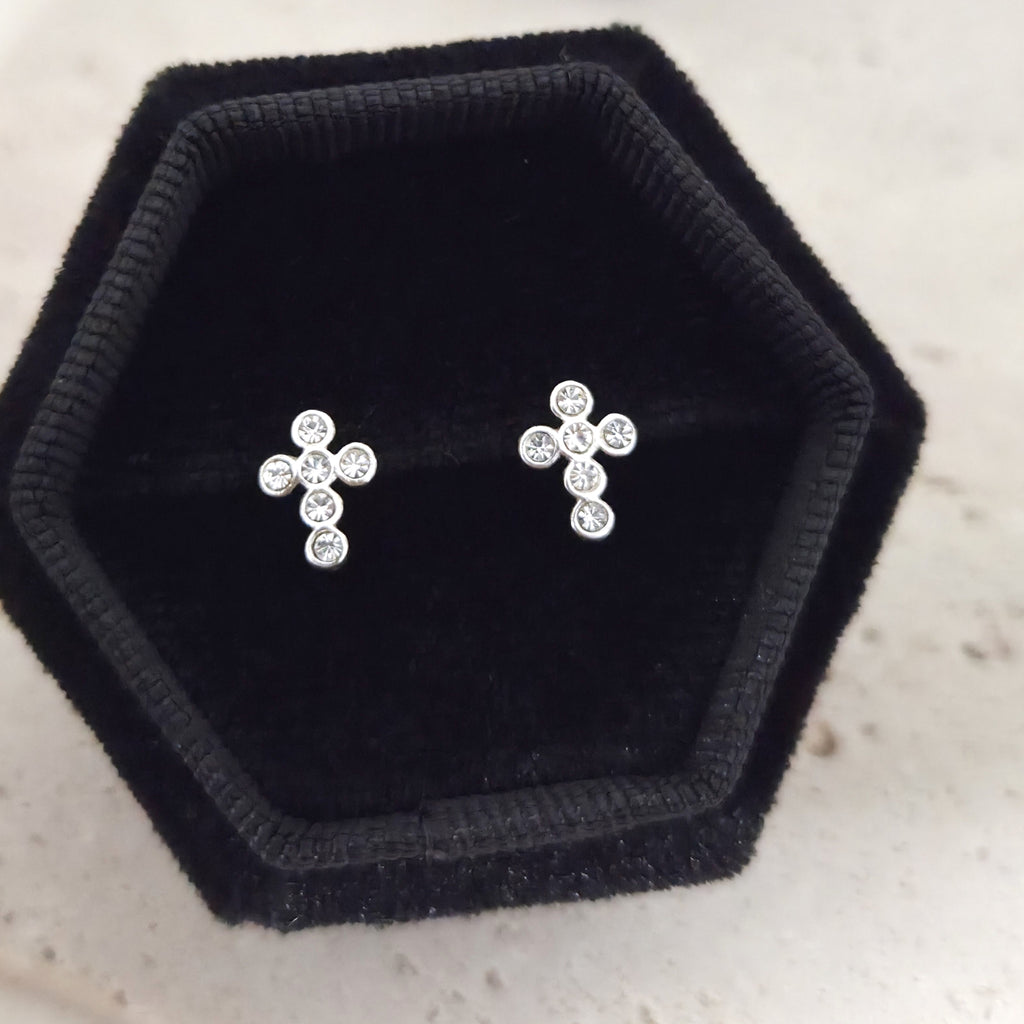 Tiny 925 Sterling Silver Cross Stud Earrings – Solid Silver Cross Studs with White Crystals – Elegant and Minimalist Everyday Jewelry