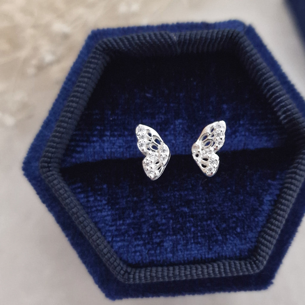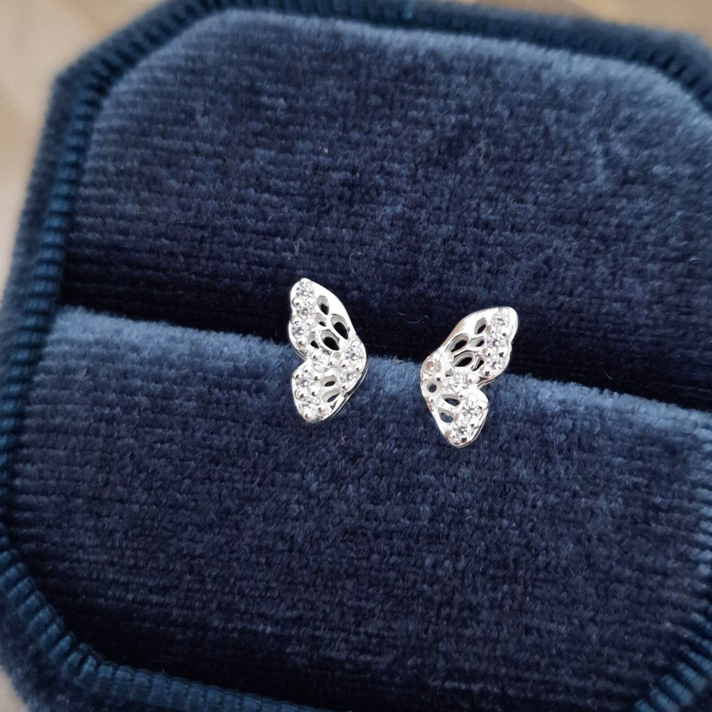 925 Sterling Silver Butterfly Stud Earrings – Butterfly Wing Studs in Solid Silver with White CZ Cubic Zirconia