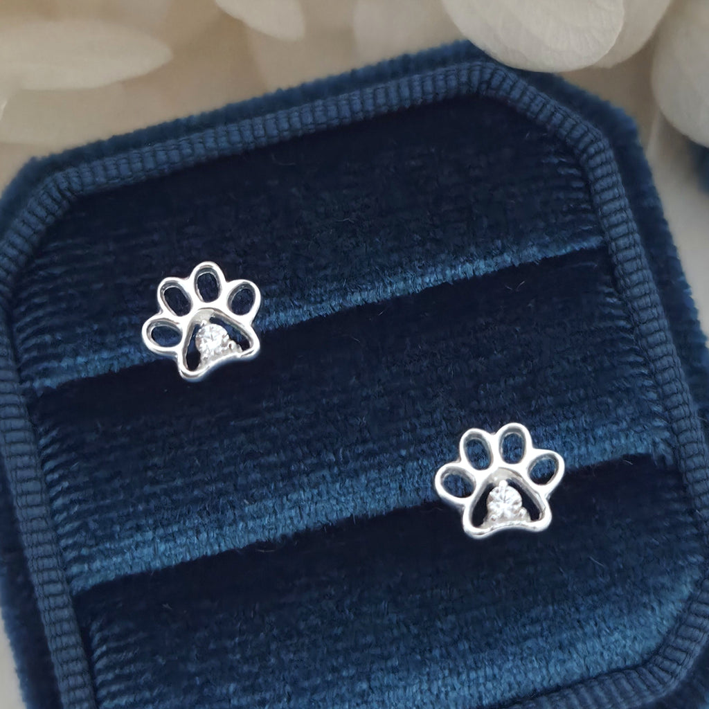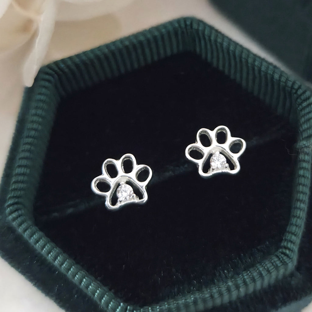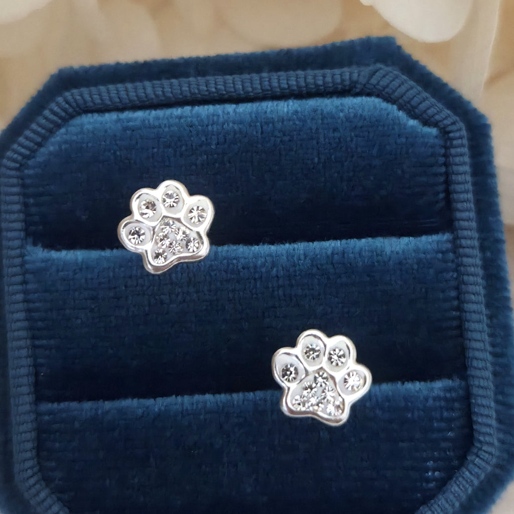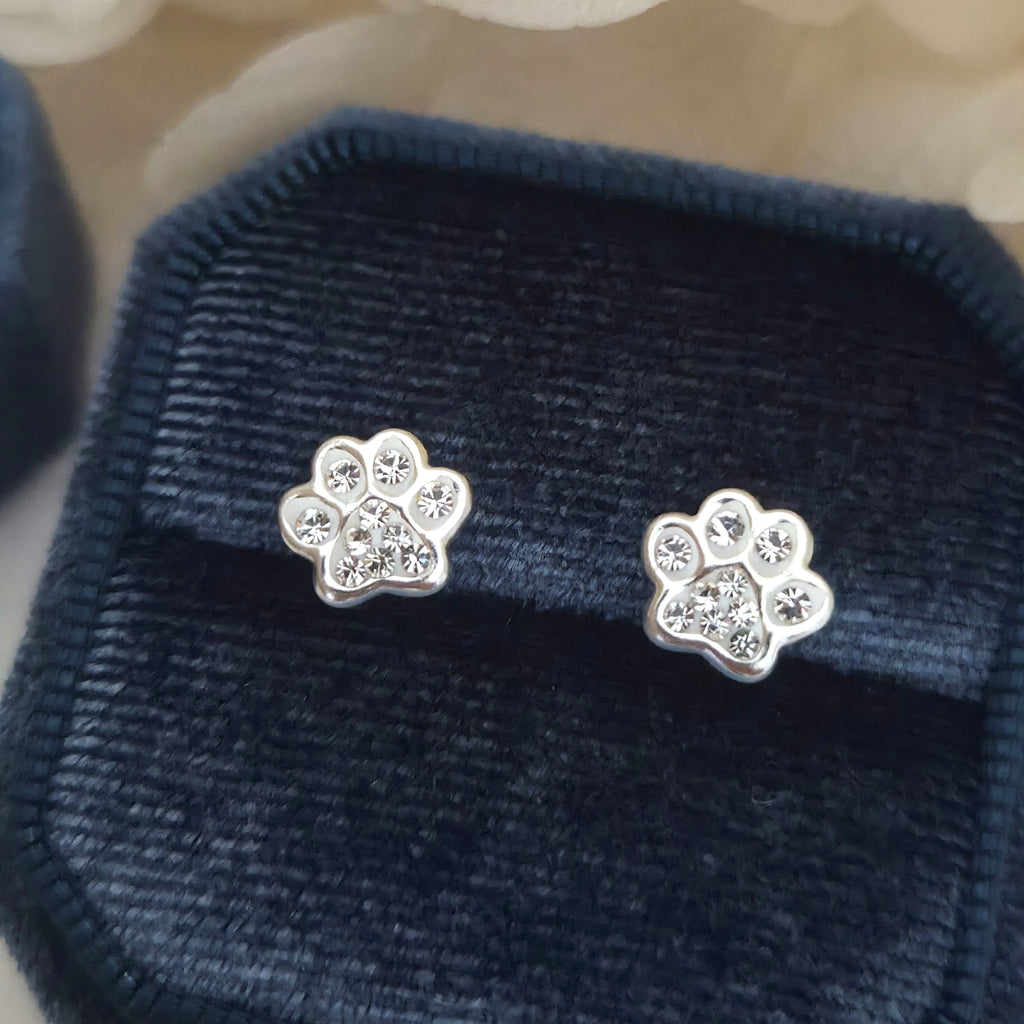 925 Sterling Silver Paw Print Stud Earrings – Dog Paw Studs in Solid Silver with White Crystal – Cute Animal Jewelry Gift for Pet Lovers