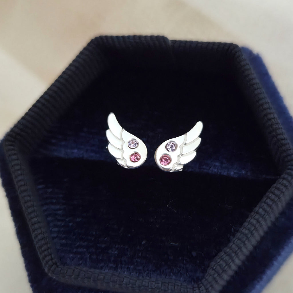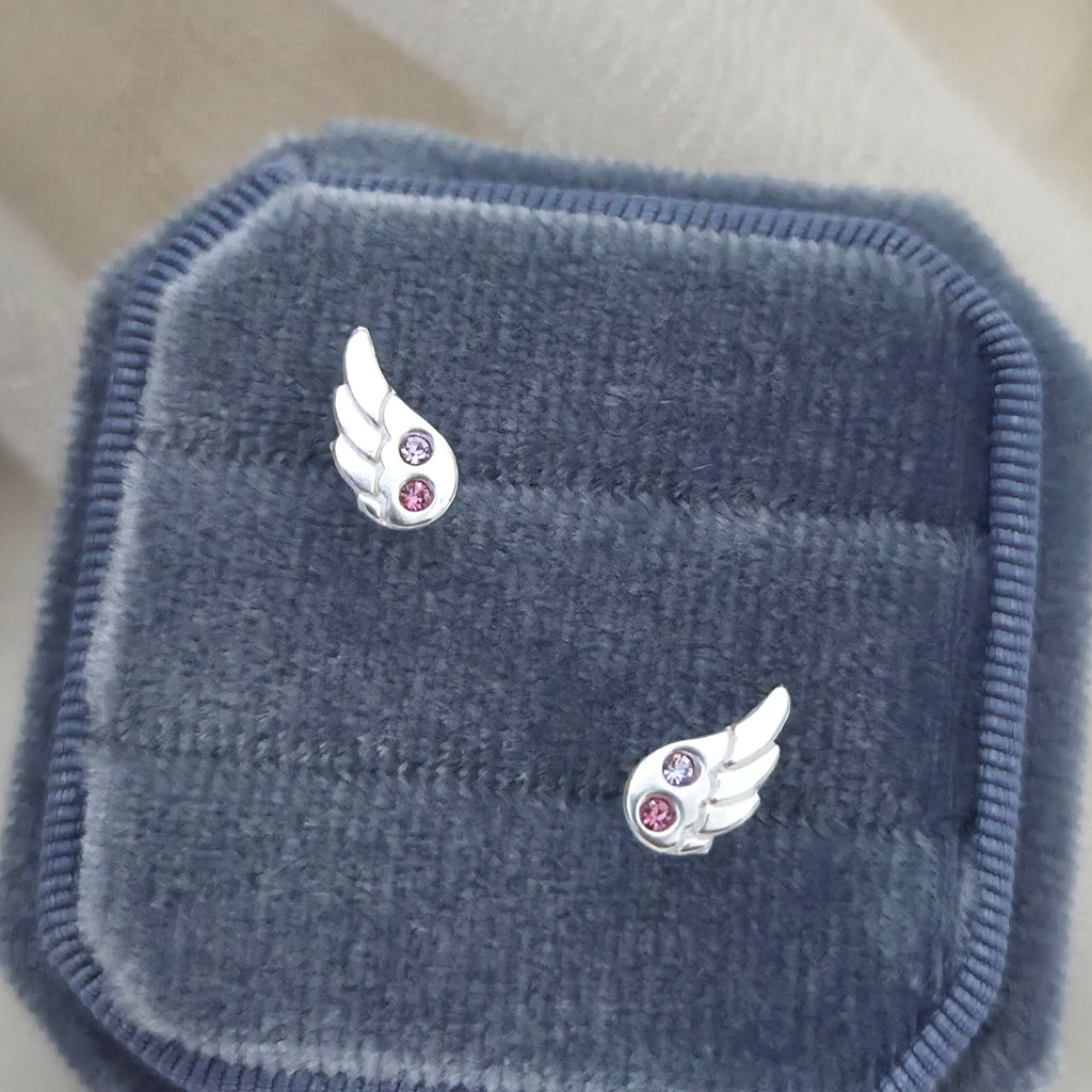 Mini 925 Sterling Silver Wing Stud Earrings – Tiny Angel Wing Studs with Pink and Purple Crystals – Cute Celestial Jewelry Gift for Her