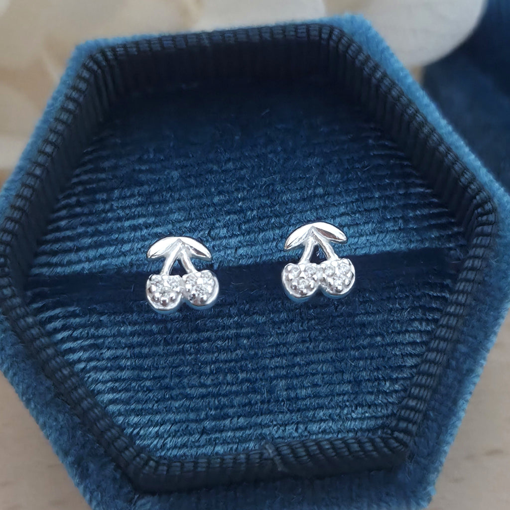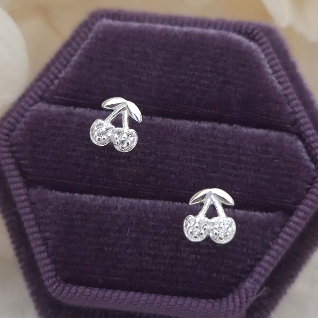 Tiny 925 Sterling Silver Cherry Stud Earrings – Cherry Studs in Solid Silver with White CZ Cubic Zirconia – Fruit Jewelry Gift for Her
