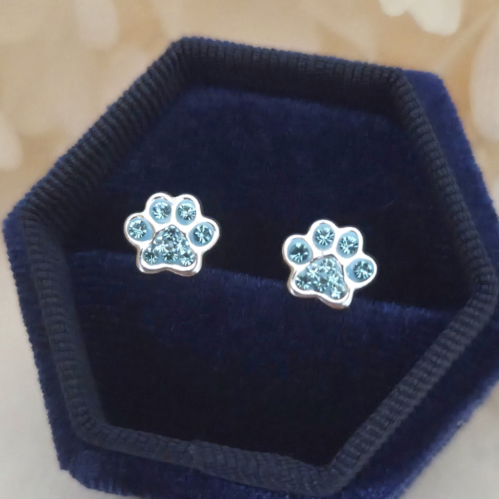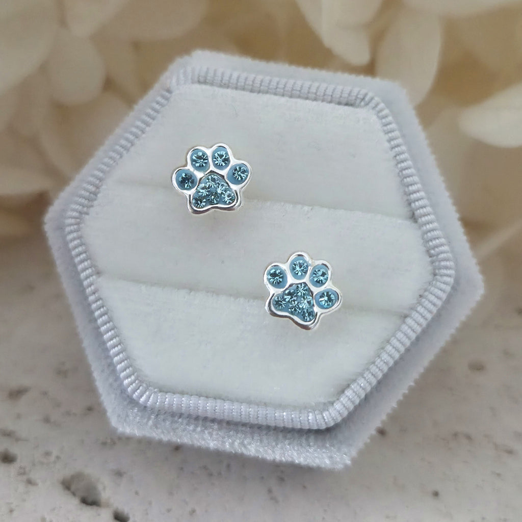 925 Sterling Silver Light Blue Paw Print Stud Earrings – Aqua Blue Dog Paw Studs in Solid Silver with Aqua Bohemica Crystal