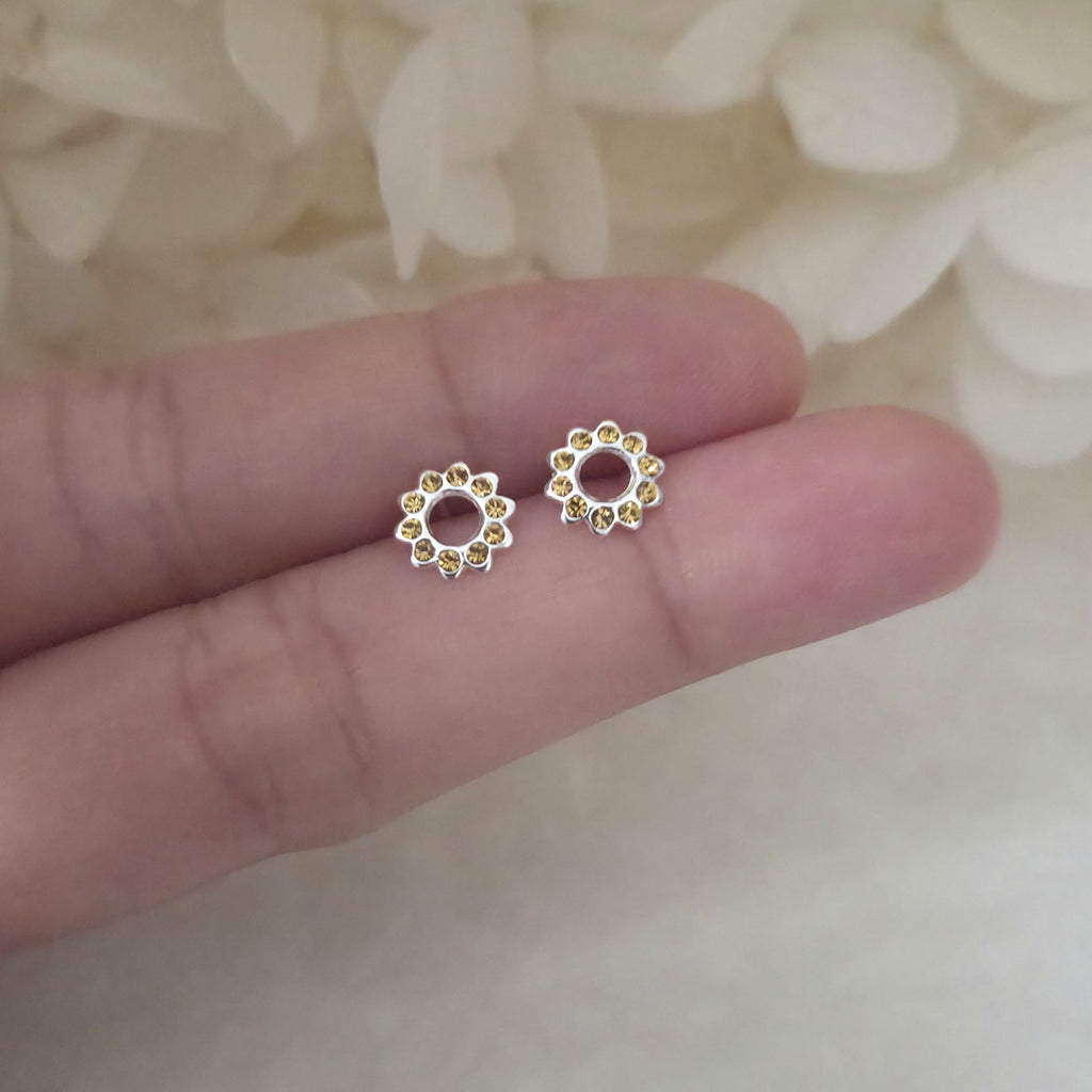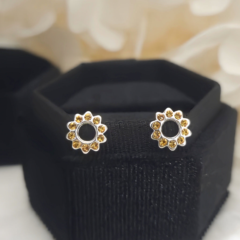 925 Sterling Silver Yellow Topaz Sun Stud Earrings – Solid Silver Yellow Sunburst Studs with Crystals