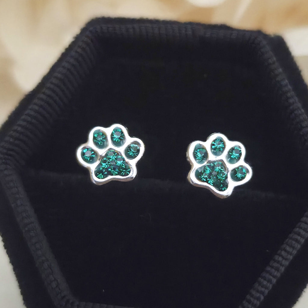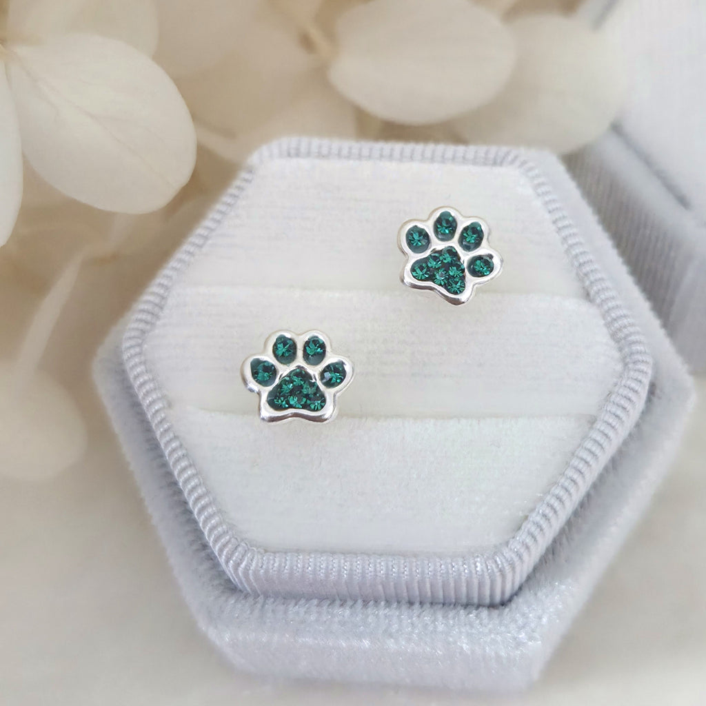 925 Sterling Silver Dog Paw Print Stud Earrings – Green Paw Studs in Solid Silver with Emerald Crystal – Cute Pet Jewelry Gift for Her