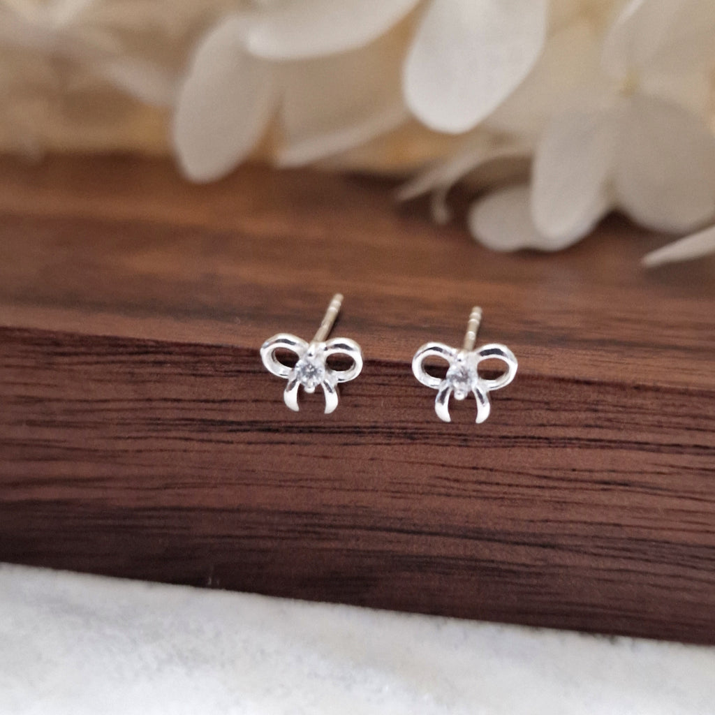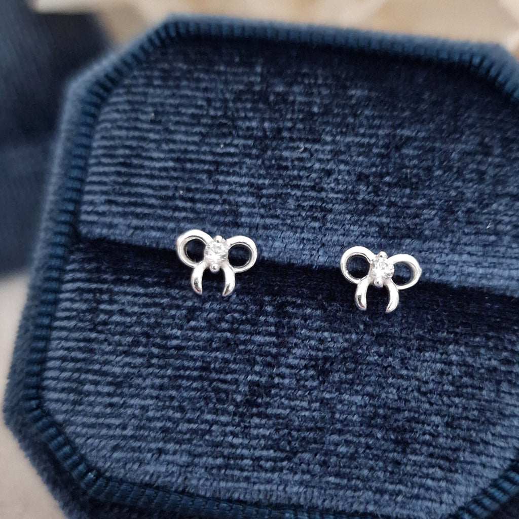 Tiny 925 Sterling Silver Bow Stud Earrings – Ribbon Studs in Solid Silver with White CZ Cubic Zirconia