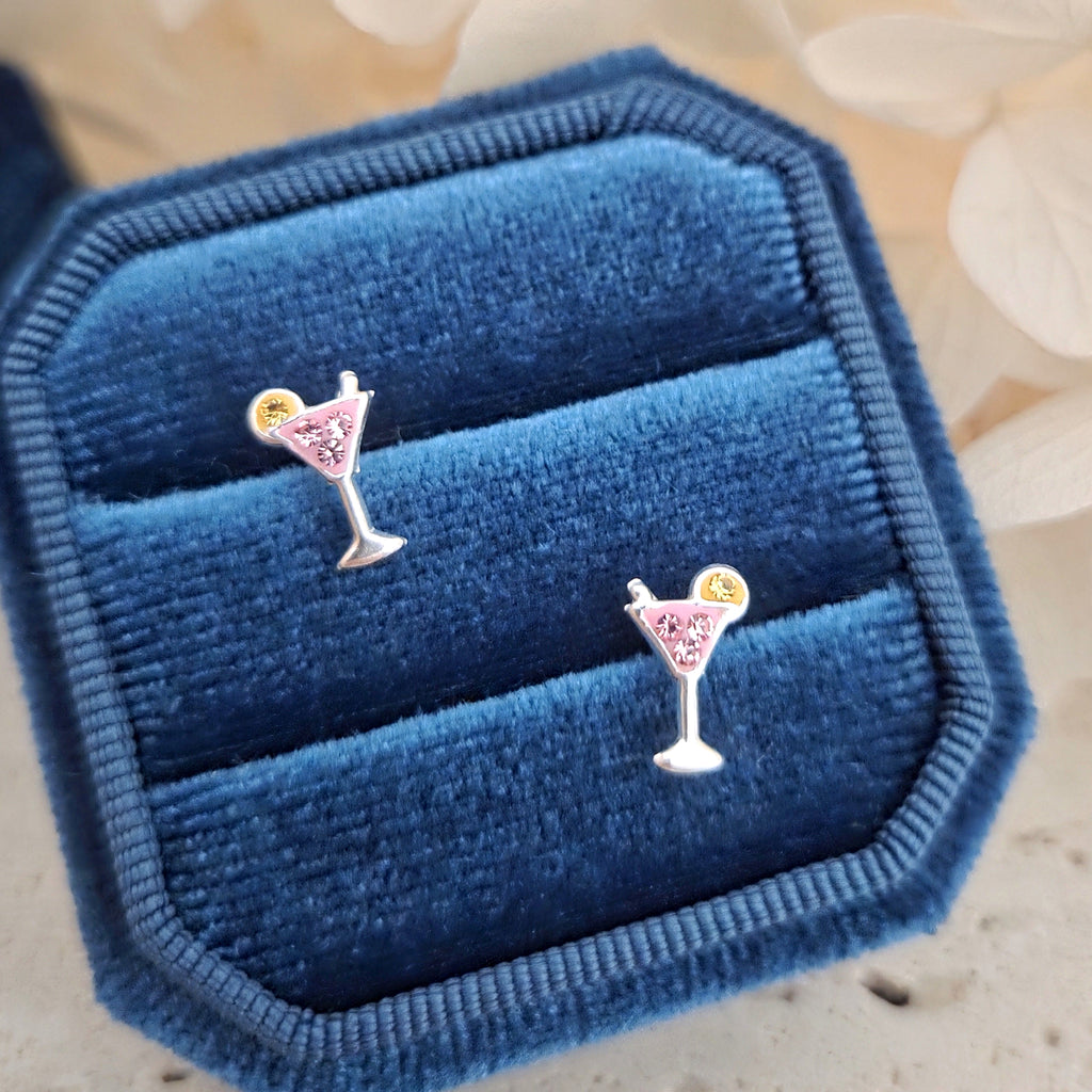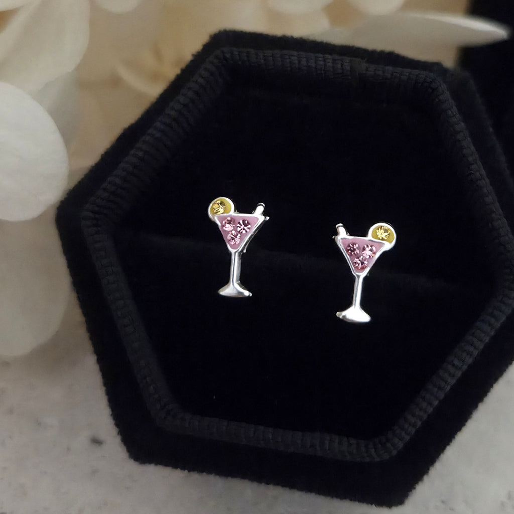 Pink Cocktail Glass Stud Earrings in 925 Sterling Silver – Summer Beach Drink Studs with Pink Enamel & Crystals