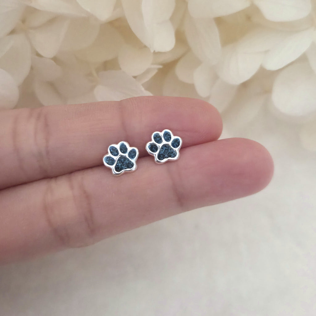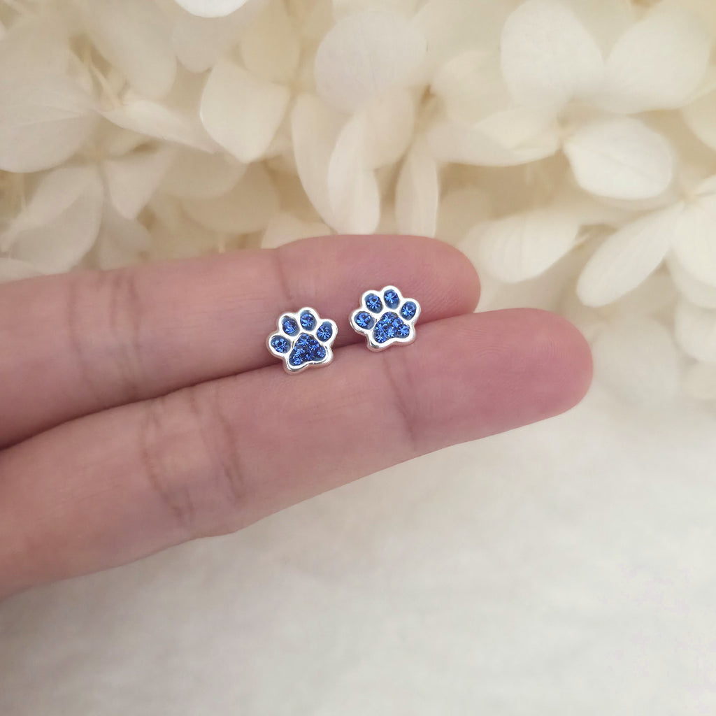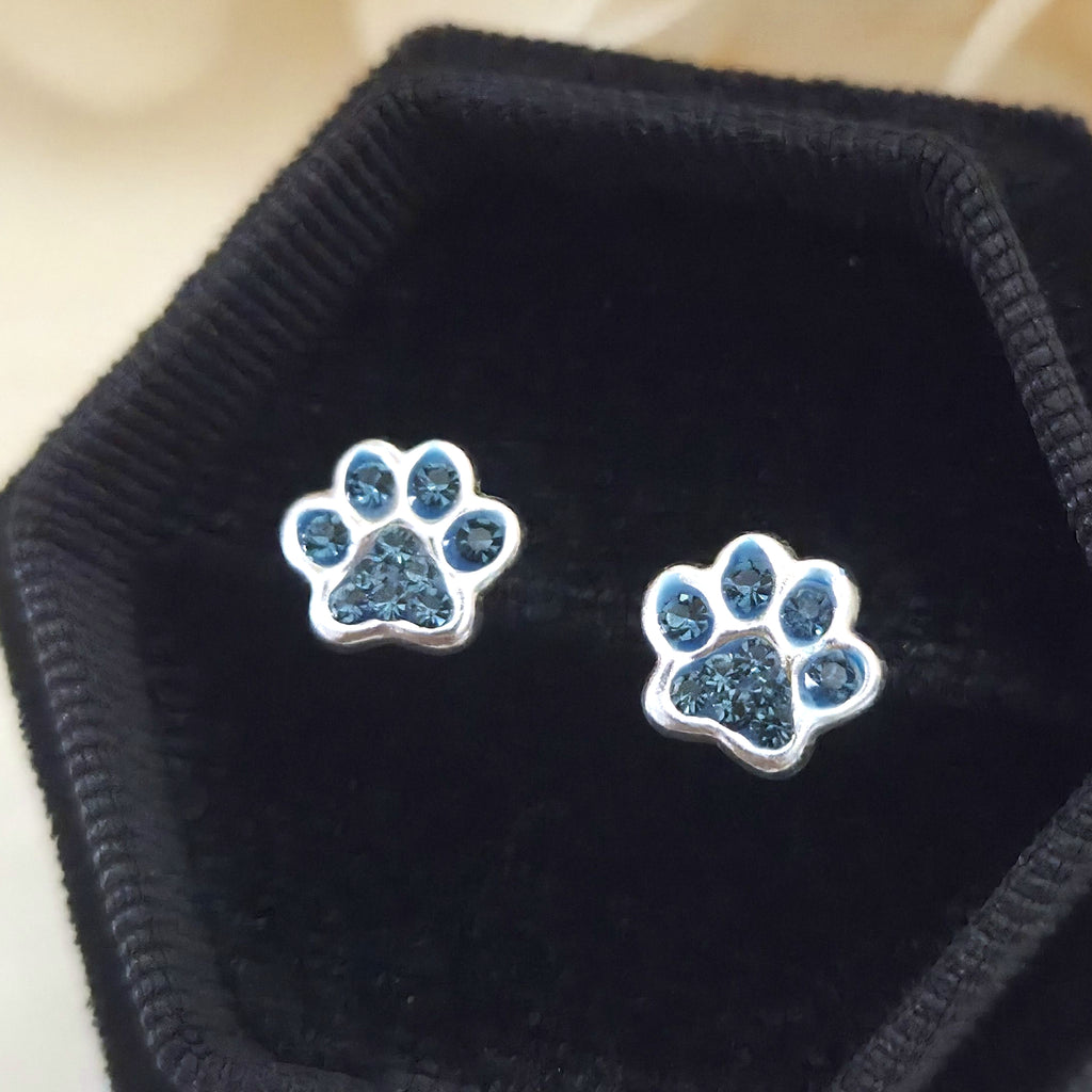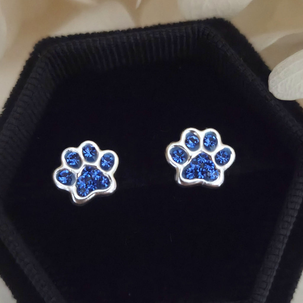 925 Sterling Silver Paw Print Stud Earrings – Dark Blue Paw Studs in Solid Silver with Montana Crystal – Pet Lover Jewelry Gift for Her