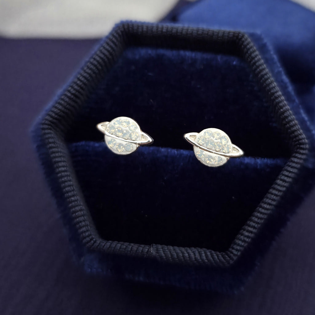 925 Sterling Silver Saturn Stud Earrings with White Opal Crystals – Solid Silver White Opal Planet Earrings